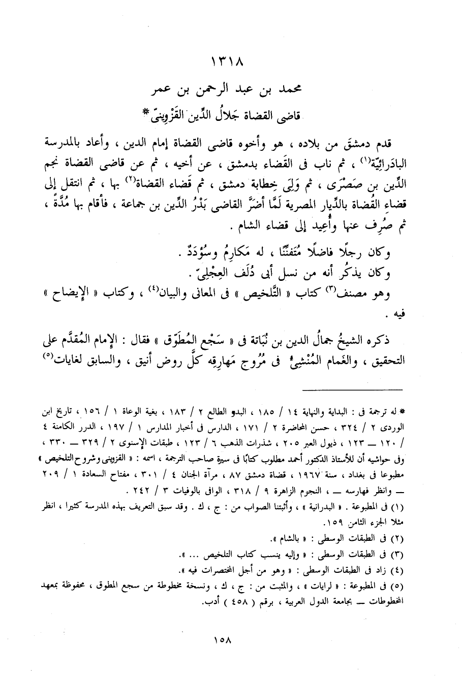 1318 - مُحَمَّد بن عبد الرَّحْمَن بن عمر قَاضِي الْقُضَاة جلال الدّين الْقزْوِينِي