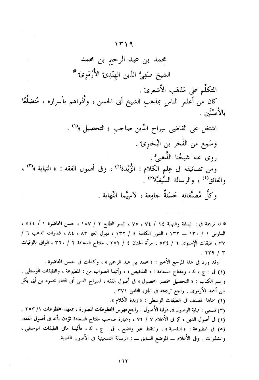1319 - مُحَمَّد بن عبد الرَّحِيم بن مُحَمَّد الشَّيْخ صفي الدّين الْهِنْدِيّ الأرموي