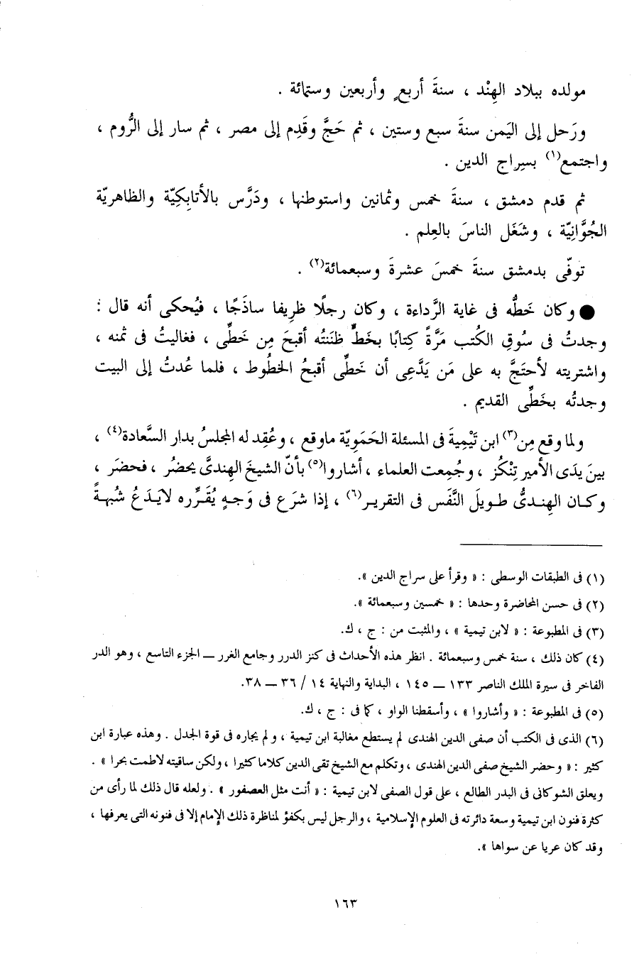 وَلما وَقع من ابْن تَيْمِية فِي المسئلة الحموية مَا وَقع وَعقد لَهُ الْمجْلس بدار السَّعَادَة بَين يَدي الْأَمِير تنكز وجمعت الْعلمَاء أشاروا بِأَن الشَّيْخ الْهِنْدِيّ يحضر فَحَضَرَ وَكَانَ الْهِنْدِيّ طَوِيل النَّفس فِي التَّقْرِير إِذا شرع فِي وَجه يقرره لَا يدع شُبْهَة