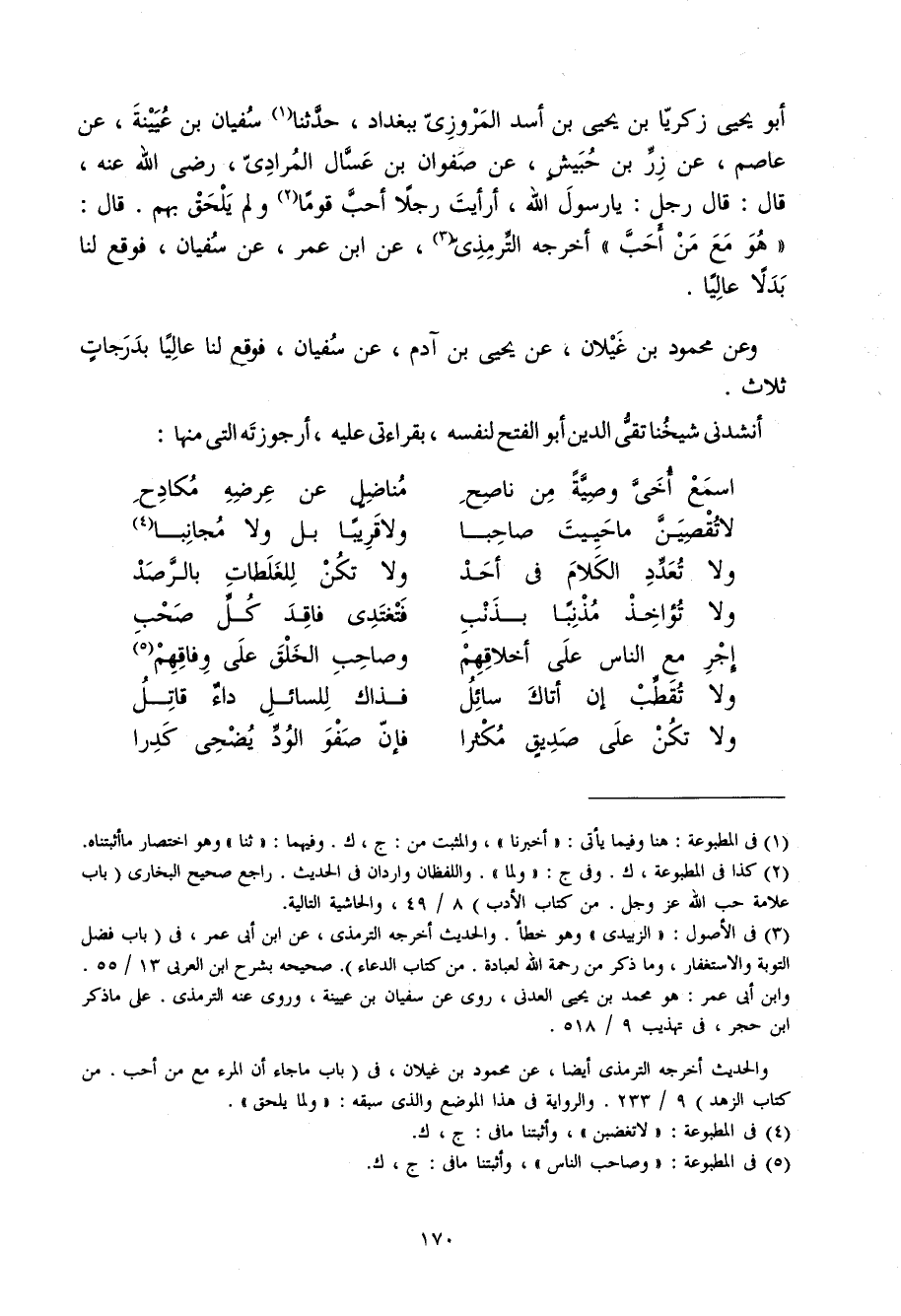 أَبُو يحيى زَكَرِيَّا بن يحيى بن أَسد الْمروزِي بِبَغْدَاد حَدثنَا سُفْيَان بن عُيَيْنَة عَن عَاصِم عَن زر بن حُبَيْش عَن صَفْوَان بن عَسَّال الْمرَادِي رَضِي الله عَنهُ قَالَ قَالَ رجل يَا رَسُول الله أَرَأَيْت رجلا أحب قوما وَلم يلْحق بهم قَالَ هُوَ مَعَ من أحب أخرجه التِّرْمِذِيّ عَن ابْن عمر عَن سُفْيَان فَوَقع لنا بَدَلا عَالِيا