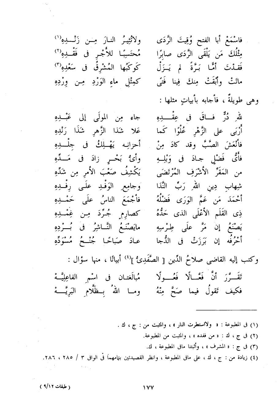 وَكتب إِلَيْهِ القَاضِي صَلَاح الدّين الصَّفَدِي أبياتا مِنْهَا سُؤال