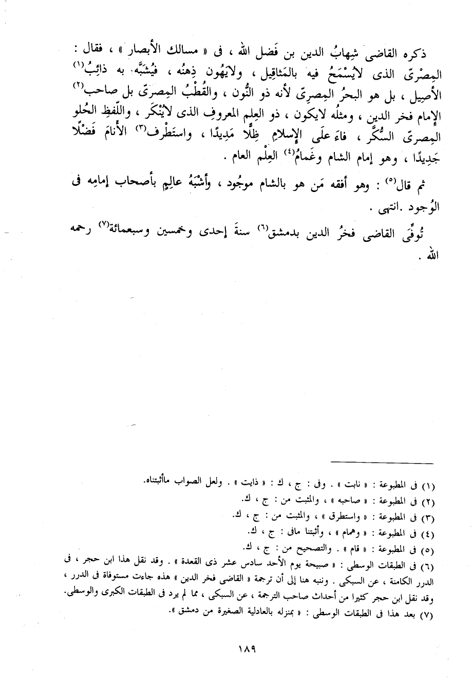 ذكره القَاضِي شهَاب الدّين بن فضل الله فِي مسالك الْأَبْصَار فَقَالَ الْمصْرِيّ الَّذِي لَا يسمح فِيهِ بالمثاقيل وَلَا يهون ذهنه فَيُشبه بِهِ ذائب الْأَصِيل بل هُوَ الْبَحْر الْمصْرِيّ لِأَنَّهُ ذُو النُّون والقطب الْمصْرِيّ بل صَاحب الإِمَام فَخر الدّين وَمثله لَا يكون ذُو الْعلم الْمَعْرُوف الَّذِي لَا يُنكر وَاللَّفْظ الحلو الْمصْرِيّ السكر فَاء على الْإِسْلَام ظلا مديدا واستطرف الْأَنَام فضلا جَدِيدا وَهُوَ إِمَام الشَّام وغمام الْعلم الْعَام
