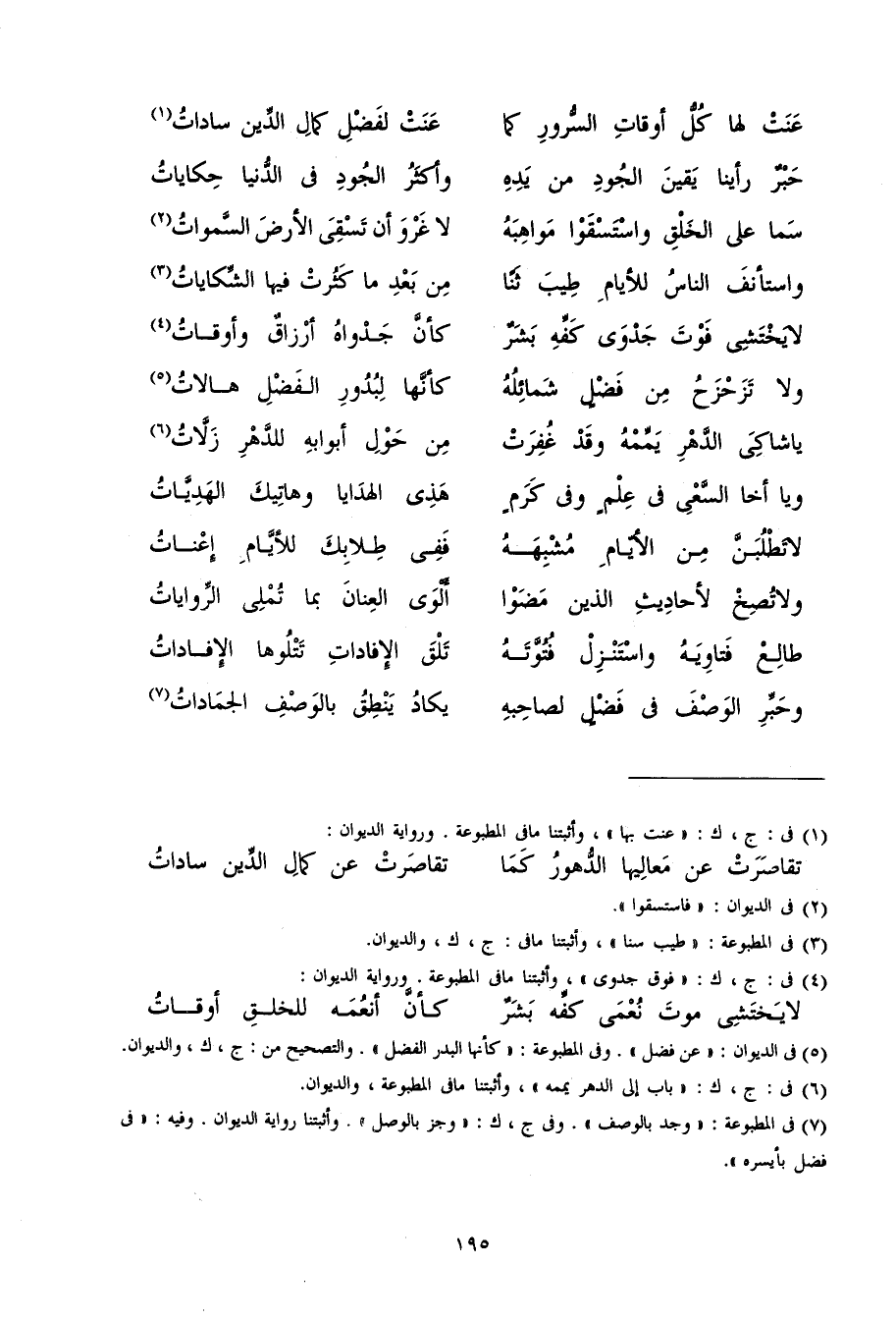 (عنت لَهَا كل أَوْقَات السرُور كَمَا ... عنت لفضل كَمَال الدّين سَادَات)