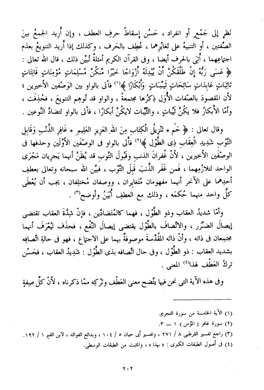 وَقَالَ تَعَالَى {حم تَنْزِيل الْكتاب من الله الْعَزِيز الْعَلِيم غَافِر الذَّنب وقابل التوب شَدِيد الْعقَاب ذِي الطول} فَأتى بِالْوَاو فِي الوصفين الْأَوَّلين وحذفها فِي الوصفين الْأَخيرينِ لِأَن غفران الذَّنب وَقبُول التوب قد يظنّ أَنَّهُمَا يجريان مجْرى الْوَاحِد لتلازمهما فَمن غفر الذَّنب قبل التوب فَبين الله سُبْحَانَهُ وَتَعَالَى بعطف أَحدهمَا على الآخر أَنَّهُمَا مفهومان متغايران ووصفان مُخْتَلِفَانِ يجب أَن يعْطى كل وَاحِد مِنْهُمَا حكمه وَذَلِكَ مَعَ الْعَطف أبين وأوضح