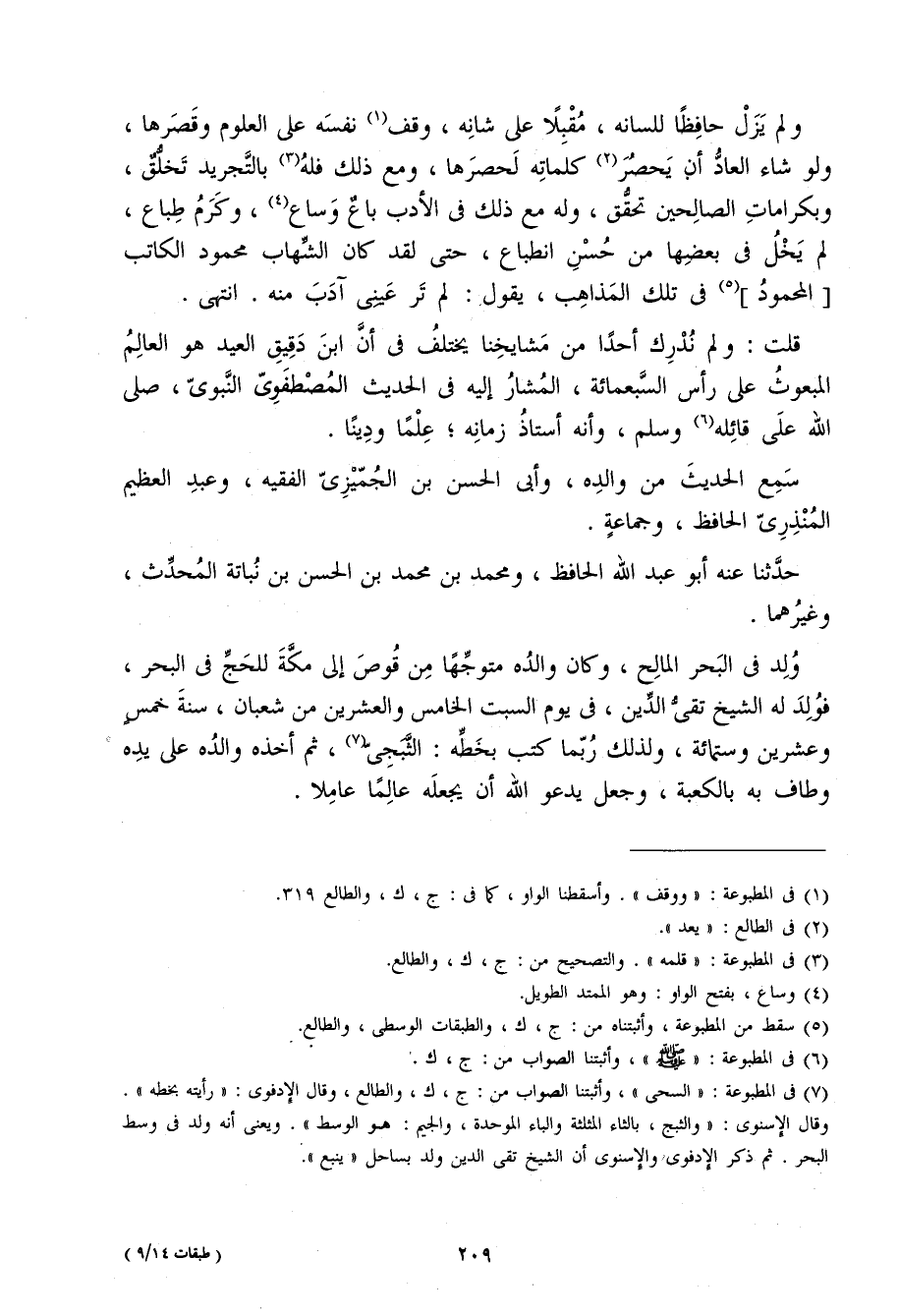 قلت وَلم ندرك أحدا من مَشَايِخنَا يخْتَلف فِي أَن ابْن دَقِيق الْعِيد هُوَ الْعَالم الْمَبْعُوث على رَأس السبعمائة الْمشَار إِلَيْهِ فِي الحَدِيث المصطفوي النَّبَوِيّ صلى الله عَلَيْهِ وَسلم قَائِله وَسلم وَأَنه أستاذ زَمَانه علما ودينا