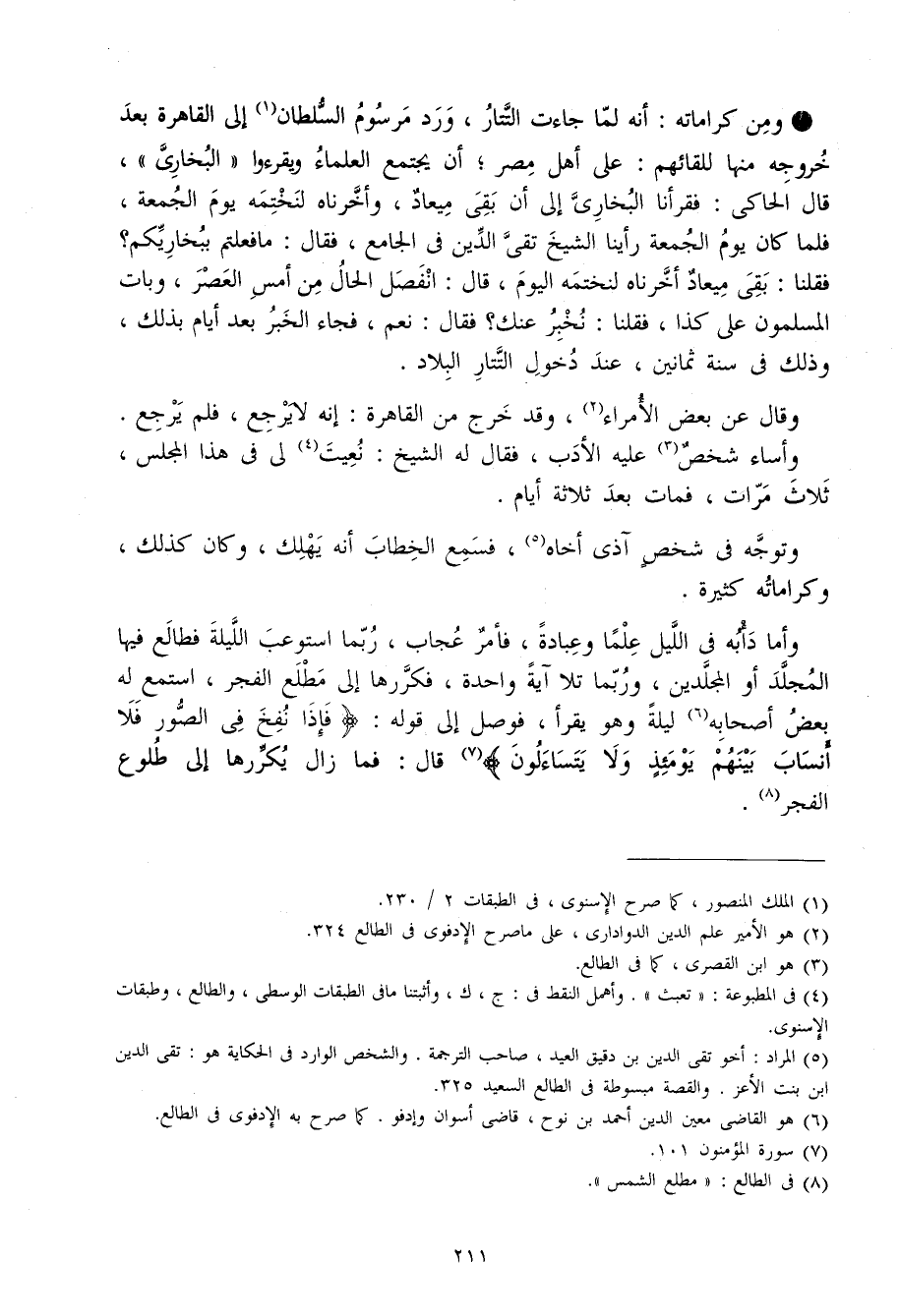وَمن كراماته أَنه لما جَاءَت التتار ورد مرسوم السُّلْطَان إِلَى الْقَاهِرَة بعد خُرُوجه مِنْهَا للقائهم على أهل مصر أَن يجْتَمع الْعلمَاء ويقرءوا البُخَارِيّ قَالَ الحاكي فقرأنا البُخَارِيّ إِلَى أَن بَقِي ميعاد وأخرناه لنختمه يَوْم الْجُمُعَة فَلَمَّا كَانَ يَوْم الْجُمُعَة رَأينَا الشَّيْخ تَقِيّ الدّين فِي الْجَامِع فَقَالَ مَا فَعلْتُمْ ببخاريكم فَقُلْنَا بَقِي ميعاد أخرناه لنختمه الْيَوْم قَالَ انْفَصل الْحَال من أمس الْعَصْر وَبَات الْمُسلمُونَ على كَذَا فَقُلْنَا نخبر عَنْك فَقَالَ نعم فجَاء الْخَبَر بعد أَيَّام بذلك وَذَلِكَ فِي سنة ثَمَانِينَ عِنْد دُخُول التتار الْبِلَاد