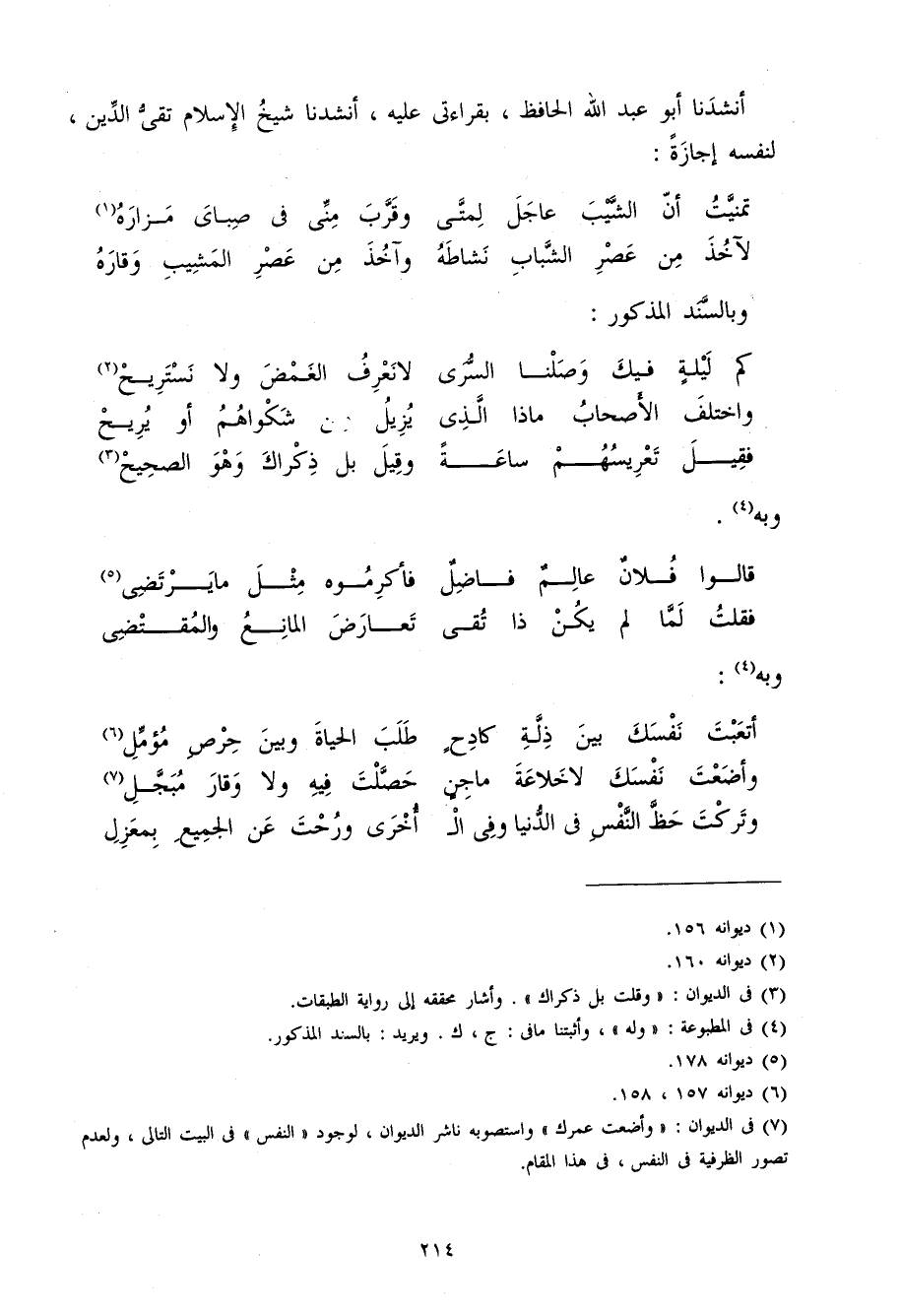 أنشدنا أَبُو عبد الله الْحَافِظ بِقِرَاءَتِي عَلَيْهِ أنشدنا شيخ الْإِسْلَام تَقِيّ الدّين لنَفسِهِ إجَازَة
