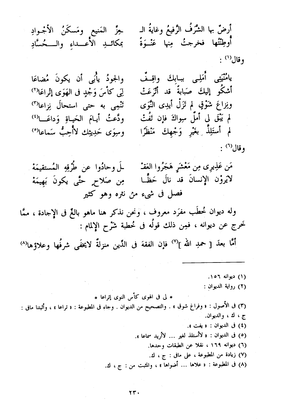 وَله ديوَان خطب مُفْرد مَعْرُوف وَنحن نذْكر هُنَا مَا هُوَ بَالغ فِي الإجادة مِمَّا خرج عَن ديوانه فَمن ذَلِك قَوْله فِي خطْبَة شرح الْإِلْمَام