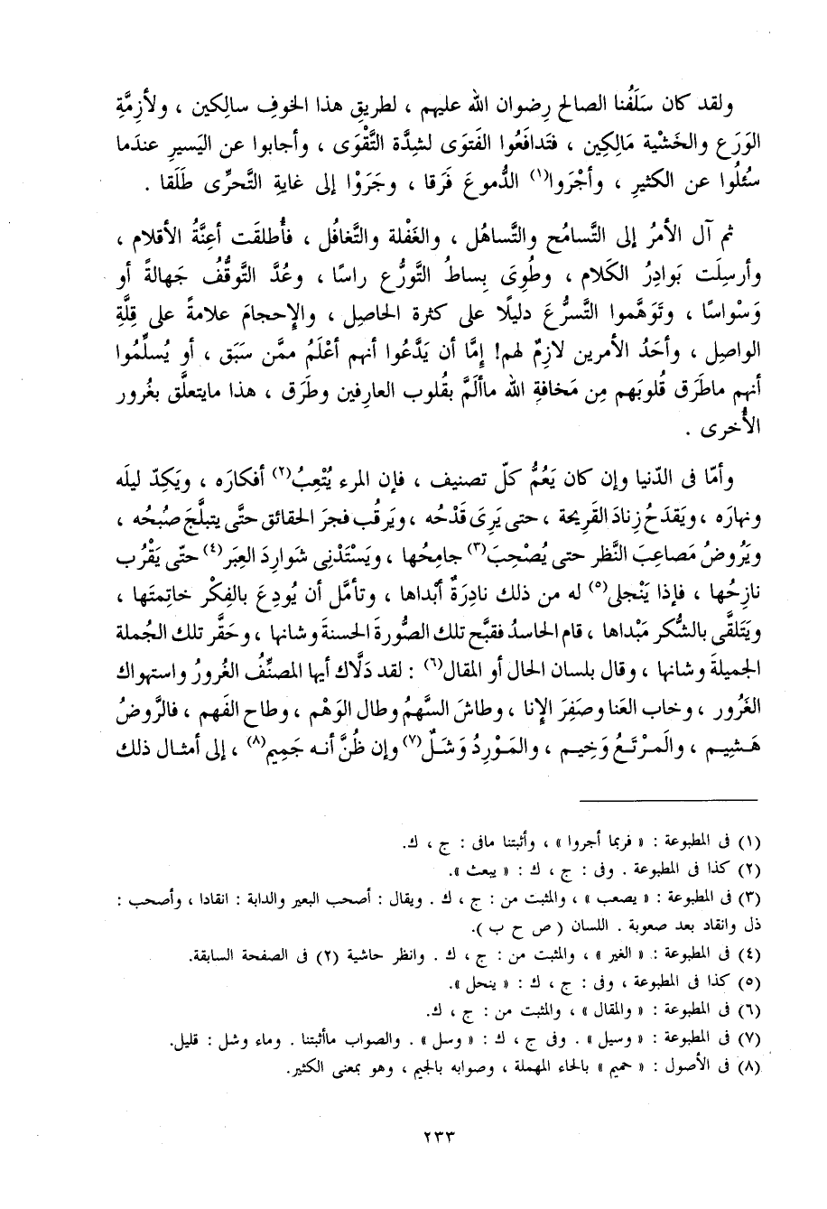 ثمَّ آل الْأَمر إِلَى التسامح والتساهل والغفلة والتغافل فأطلقت أَعِنَّة الأقلام وَأرْسلت بَوَادِر الْكَلَام وطوي بِسَاط التورع راسا وعد التَّوَقُّف جَهَالَة أَو وسواسا وتوهموا التسرع دَلِيلا على كَثْرَة الْحَاصِل والإحجام عَلامَة على قلَّة الْوَاصِل وَأحد الْأَمريْنِ لَازم لَهُم إِمَّا أَن يدعوا أَنهم أعلم مِمَّن سبق أَو يسلمُوا أَنهم مَا طرق قُلُوبهم من مَخَافَة الله مَا ألم بقلوب العارفين وطرق هَذَا مَا يتَعَلَّق بغرور الْأُخْرَى