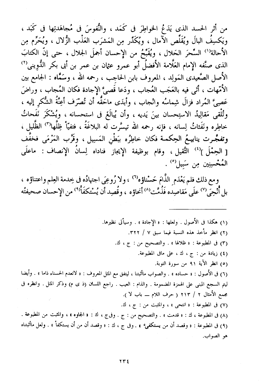 من أثر الْحَسَد الَّذِي يدع الخواطر فِي كمد والنفوس فِي مجاهدتها فِي كبد ويكسف البال ويقلص الآمال ويكدر من المشرب العذب الزلَال وَيحرم من الأحالة السحر الْحَلَال ويقبح من الْإِحْسَان أجمل الْجلَال حَتَّى إِن الْكتاب الَّذِي صنفه الإِمَام الْعَلامَة الْأَفْضَل أَبُو عَمْرو عُثْمَان بن عمر بن أبي بكر الدويني الأَصْل الصعيدي المولد الْمَعْرُوف بِابْن الْحَاجِب رَحمَه الله وَسَماهُ الْجَامِع بَين الْأُمَّهَات أَتَى فِيهِ بالعجب العجاب ودعا قصي الإجادة فَكَانَ المجاب وراض عصي المُرَاد فَزَالَ شماسه وانجاب وَأبْدى مَا حَقه أَن تصرف أَعِنَّة الشُّكْر إِلَيْهِ وتلقى مقاليد الِاسْتِحْسَان بَين يَدَيْهِ وَأَن يُبَالغ فِي استحسانه ويشكر نفحات خاطره ونفثات لِسَانه فَإِنَّهُ رَحمَه الله تيسرت لَهُ البلاغة فتفيأ ظلها الظليل وتفجرت ينابيع الْحِكْمَة فَكَانَ خاطره بِبَطن المسيل وَقرب المرمى فَخفف الْحمل الثقيل وَقَامَ بوظيفة الإيجاز فناداه لِسَان الْإِنْصَاف مَا على الْمُحْسِنِينَ من سَبِيل