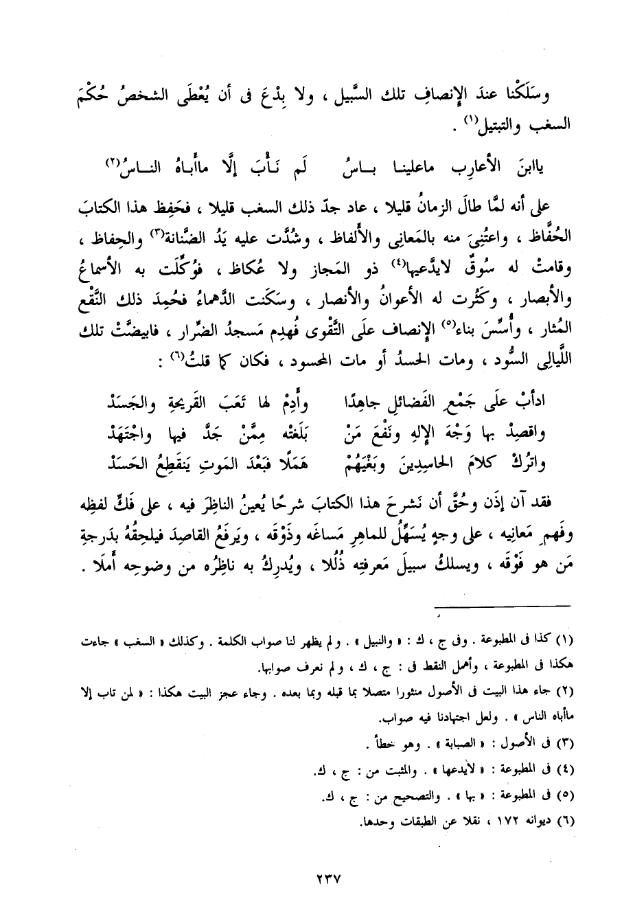 على أَنه لما طَال الزَّمَان قَلِيلا عَاد جد ذَلِك السغب قَلِيلا فحفظ هَذَا الْكتاب الْحفاظ واعتني مِنْهُ بالمعاني والألفاظ وشدت عَلَيْهِ يَد الضنانة والحفاظ وَقَامَت لَهُ سوق لَا يدعيها ذُو الْمجَاز وَلَا عكاظ فوكلت بِهِ الأسماع والأبصار وَكَثُرت لَهُ الأعوان وَالْأَنْصَار وسكنت الدهماء فَحَمدَ ذَلِك النَّقْع المثار وَأسسَ بِنَاء الْإِنْصَاف على التَّقْوَى فهدم مَسْجِد الضرار فابيضت تِلْكَ اللَّيَالِي السود وَمَات الْحَسَد أَو مَاتَ الْمَحْسُود فَكَانَ كَمَا قلت