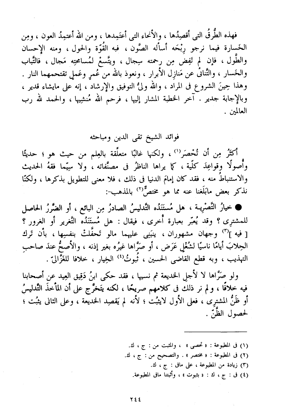 فَوَائِد الشَّيْخ تَقِيّ الدّين ومباحثه
