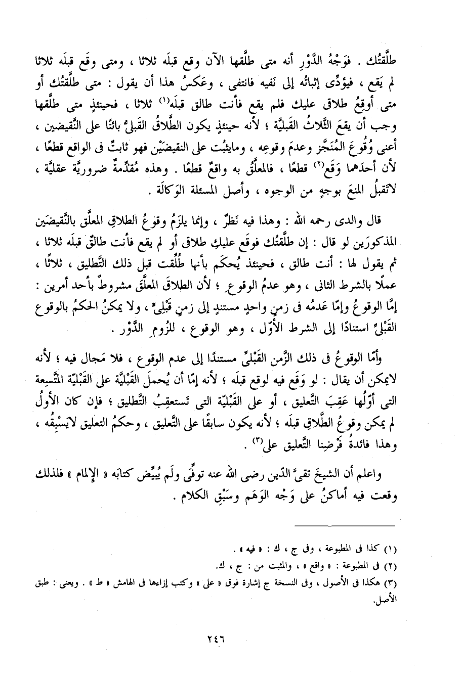 وَاعْلَم أَن الشَّيْخ تَقِيّ الدّين رَضِي الله عَنهُ توفّي وَلم يبيض كِتَابه الْإِلْمَام فَلذَلِك وَقعت فِيهِ أَمَاكِن على وَجه الْوَهم وَسبق الْكَلَام