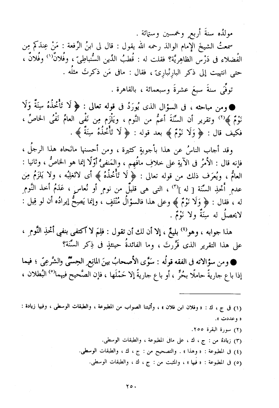 وَمن مباحثه فِي السُّؤَال الَّذِي يُورد فِي قَوْله تَعَالَى {لَا تَأْخُذهُ سنة وَلَا نوم} وَتَقْرِير أَن السّنة أَعم من النّوم وَيلْزم من نفي الْعَام نفي الْخَاص فَكيف قَالَ {وَلَا نوم} بعد قَوْله {لَا تَأْخُذهُ سنة}