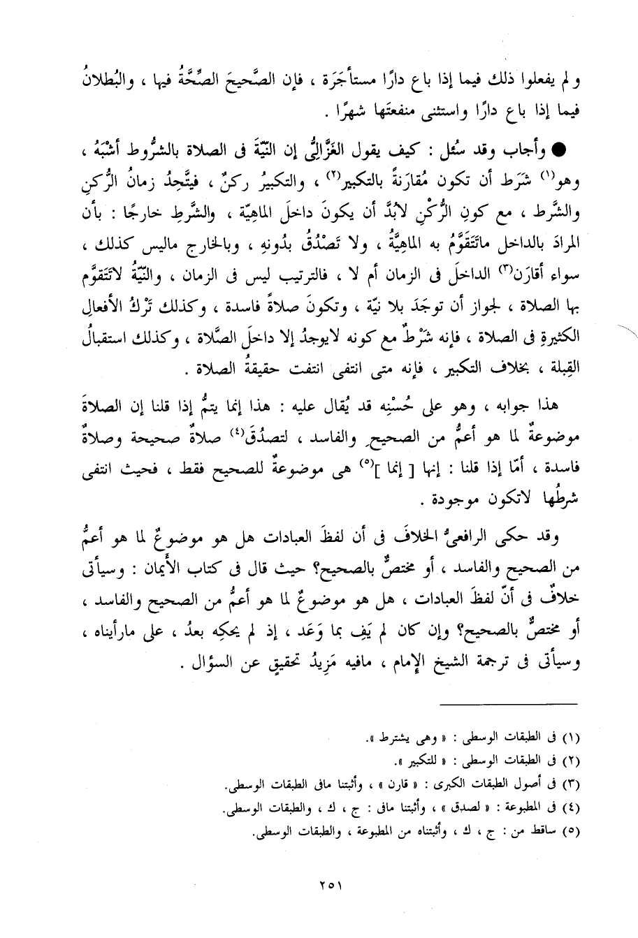 وَأجَاب وَقد سُئِلَ كَيفَ يَقُول الْغَزالِيّ إِن النِّيَّة فِي الصَّلَاة بِالشُّرُوطِ أشبه وَهُوَ شَرط أَن تكون مُقَارنَة بِالتَّكْبِيرِ وَالتَّكْبِير ركن فيتحد زمَان الرُّكْن وَالشّرط مَعَ كَون الرُّكْن لَا بُد أَن يكون دَاخل الْمَاهِيّة وَالشّرط خَارِجا بِأَن المُرَاد بالداخل مَا تتقوم بِهِ الْمَاهِيّة وَلَا تصدق بِدُونِهِ وبالخارج مَا لَيْسَ كَذَلِك سَوَاء أقارن الدَّاخِل فِي الزَّمَان أم لَا فالترتيب لَيْسَ فِي الزَّمَان وَالنِّيَّة لَا تتقوم بهَا الصَّلَاة لجَوَاز أَن تُوجد بِلَا نِيَّة وَتَكون صَلَاة فَاسِدَة وَكَذَلِكَ ترك الْأَفْعَال الْكَثِيرَة فِي الصَّلَاة فَإِنَّهُ شَرط مَعَ كَونه لَا يُوجد إِلَّا دَاخل الصَّلَاة وَكَذَلِكَ اسْتِقْبَال الْقبْلَة بِخِلَاف التَّكْبِير فَإِنَّهُ مَتى انْتَفَى انْتَفَت حَقِيقَة الصَّلَاة