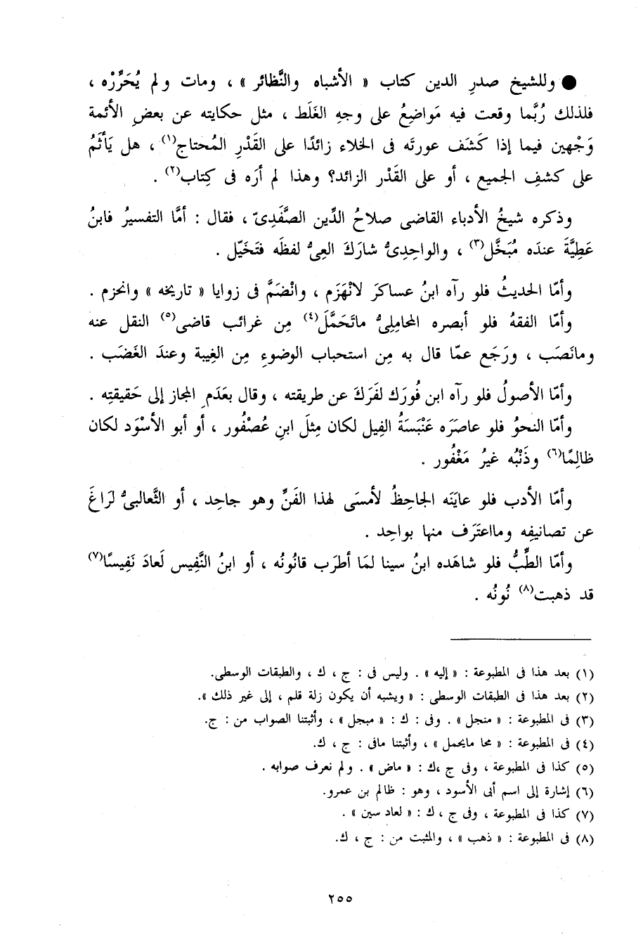 وللشيخ صدر الدّين كتاب الْأَشْبَاه والنظائر وَمَات وَلم يحرره فَلذَلِك رُبمَا وَقعت فِيهِ مَوَاضِع على وَجه الْغَلَط مثل حكايته عَن بعض الْأَئِمَّة وَجْهَيْن فِيمَا إِذا كشف عَوْرَته فِي الْخَلَاء زَائِدا على الْقدر الْمُحْتَاج هَل يَأْثَم على كشف الْجَمِيع أَو على الْقدر الزَّائِد وَهَذَا لم أره فِي كتاب