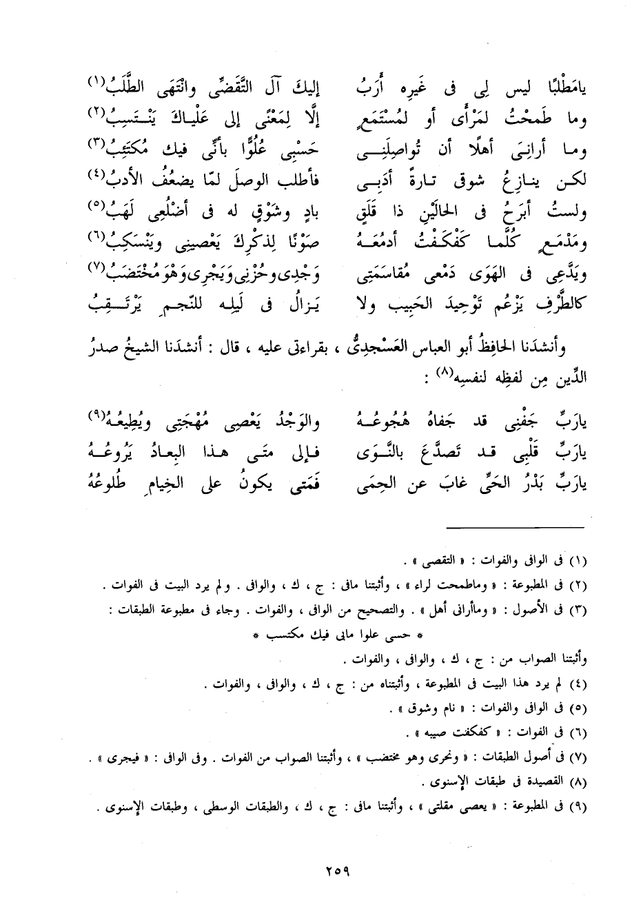 وأنشدنا الْحَافِظ أَبُو الْعَبَّاس العسجدي بِقِرَاءَتِي عَلَيْهِ قَالَ أنشدنا الشَّيْخ صدر الدّين من لَفظه لنَفسِهِ