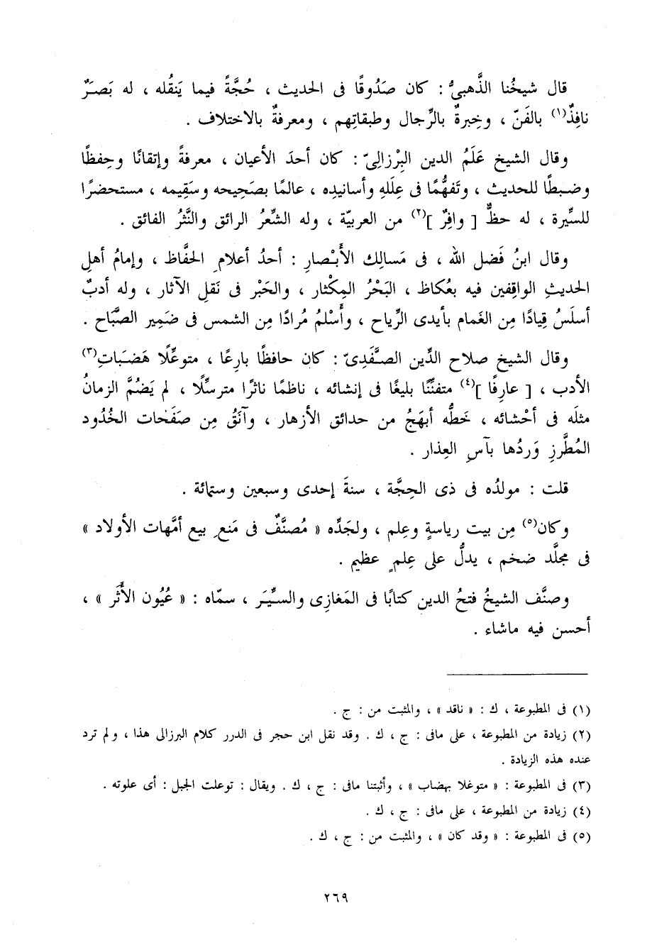 وَقَالَ الشَّيْخ صَلَاح الدّين الصَّفَدِي كَانَ حَافِظًا بارعا متوعلا هضبات الْأَدَب عَارِفًا متفننا بليغا فِي إنشائه ناظما ناثرا مترسلا لم يضم الزَّمَان مثله فِي أحشائه خطه أبهج من حدائق الأزهار وآنق من صفحات الخدود الْمُطَرز وردهَا بآس العذار