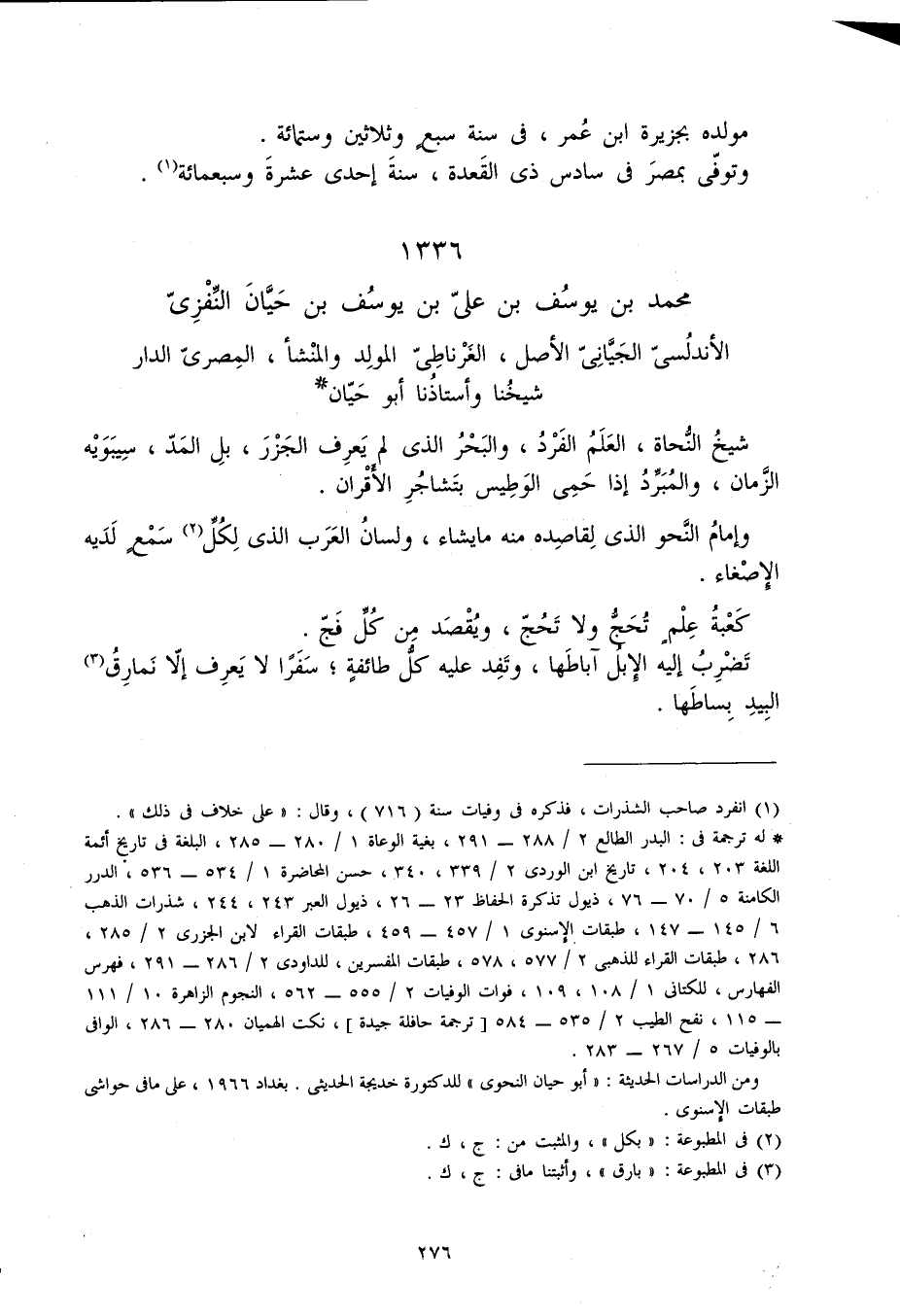 1336 - مُحَمَّد بن يُوسُف بن عَليّ بن يُوسُف بن حَيَّان النفزي الأندلسي الجياني الأَصْل الغرناطي المولد والمنشأ الْمصْرِيّ الدَّار شَيخنَا وأستاذنا أَبُو حَيَّان
