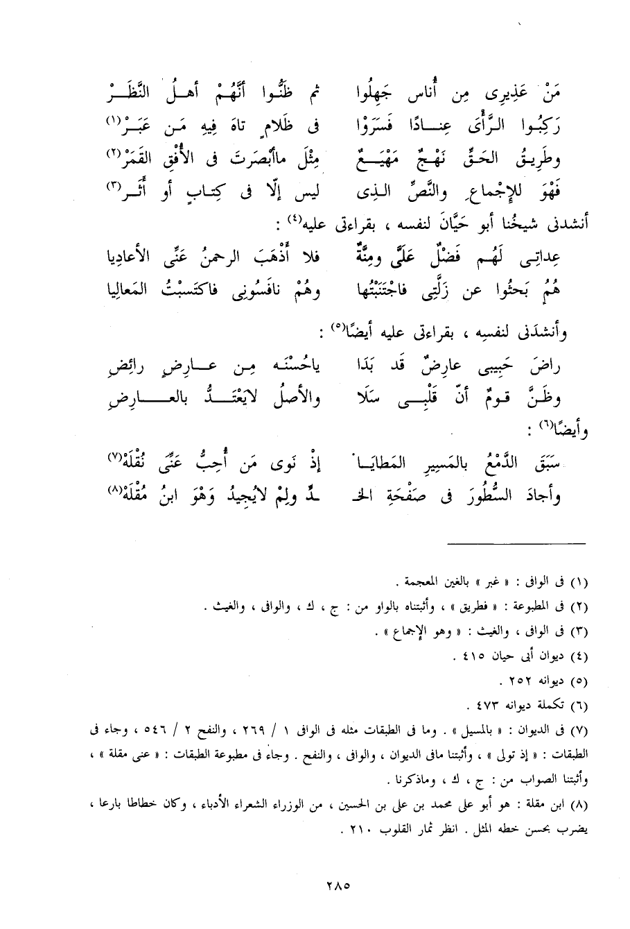 (من عذيري من أنَاس جهلوا ... ثمَّ ظنُّوا أَنهم أهل النّظر)