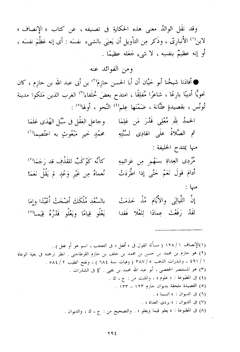 أفادنا شَيخنَا أَبُو حَيَّان أَن أَبَا الْحسن حَازِم بن أبي عبد الله بن حَازِم كَانَ نحويا أديبا بارعا شَاعِرًا مفلقا امتدح بعض خلفاء الغرب الَّذين ملكوا مَدِينَة تونس بقصيدة طنانة ضمنهَا علم النَّحْو أَولهَا