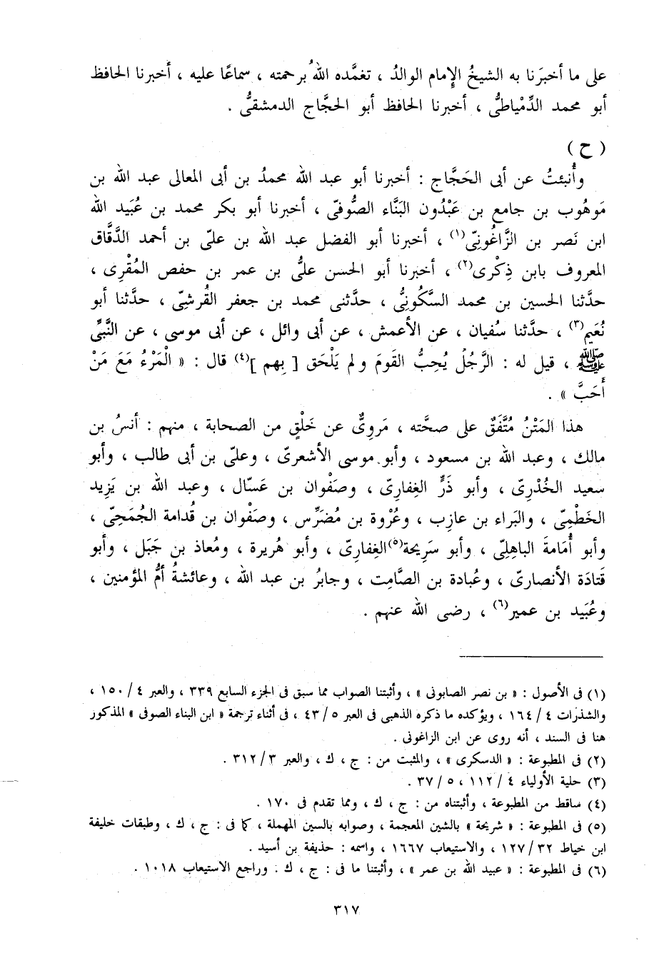 وأنبئت عَن أبي الْحجَّاج أخبرنَا أَبُو عبد الله مُحَمَّد بن أبي الْمَعَالِي عبد الله بن موهوب بن جَامع بن عبدون الْبناء الصُّوفِي أخبرنَا أَبُو بكر مُحَمَّد بن عبيد الله ابْن نصر بن الزَّاغُونِيّ أخبرنَا أَبُو الْفضل عبد الله بن عَليّ بن أَحْمد الدقاق الْمَعْرُوف بِابْن ذكرى أخبرنَا أَبُو الْحسن عَليّ بن عمر بن حَفْص الْمقري حَدثنَا الْحُسَيْن بن مُحَمَّد السكونِي حَدثنَا مُحَمَّد بن جَعْفَر الْقرشِي حَدثنَا أَبُو نعيم حَدثنَا سُفْيَان عَن الْأَعْمَش عَن أبي وَائِل عَن أبي مُوسَى عَن النَّبِي صلى الله عَلَيْهِ وَسلم قيل لَهُ الرجل يحب الْقَوْم وَلم يلْحق بهم قَالَ (الْمَرْء مَعَ من أحب)