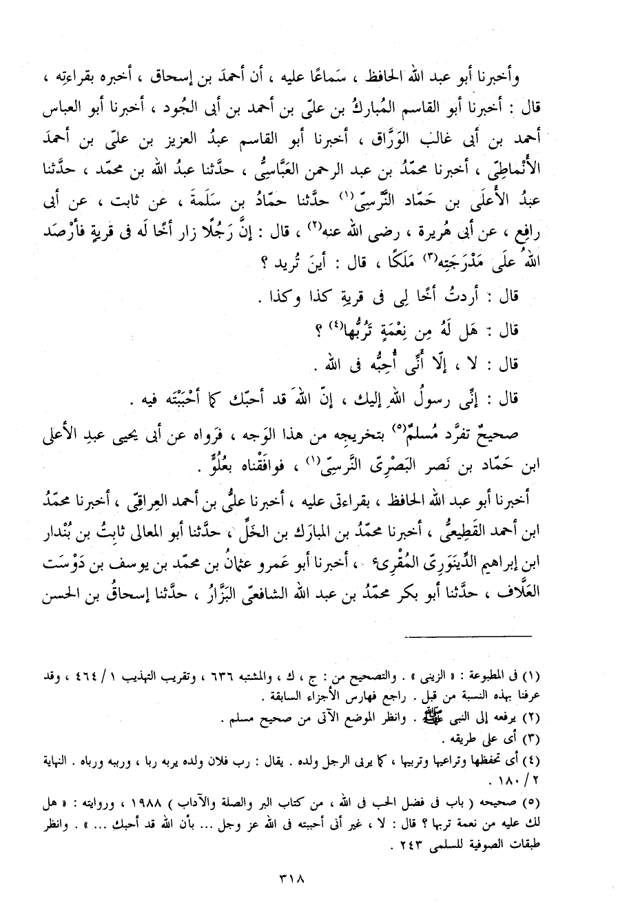 وَأخْبرنَا أَبُو عبد الله الْحَافِظ سَمَاعا عَلَيْهِ أَن أَحْمد بن إِسْحَاق أخبرهُ بقرَاءَته قَالَ أخبرنَا أَبُو الْقَاسِم الْمُبَارك بن عَليّ بن أَحْمد بن أبي الْجُود أخبرنَا أَبُو الْعَبَّاس أَحْمد بن أبي غَالب الْوراق أخبرنَا أَبُو الْقَاسِم عبد الْعَزِيز بن عَليّ بن أَحْمد الْأنمَاطِي أخبرنَا مُحَمَّد بن عبد الرَّحْمَن العباسي حَدثنَا عبد الله بن مُحَمَّد حَدثنَا عبد الْأَعْلَى بن حَمَّاد النَّرْسِي حَدثنَا حَمَّاد بن سَلمَة عَن ثَابت عَن أبي رَافع عَن أبي هُرَيْرَة رَضِي الله عَنهُ قَالَ إِن رجلا زار أَخا لَهُ فِي قَرْيَة فأرصد الله على مدرجته ملكا قَالَ أَيْن تُرِيدُ