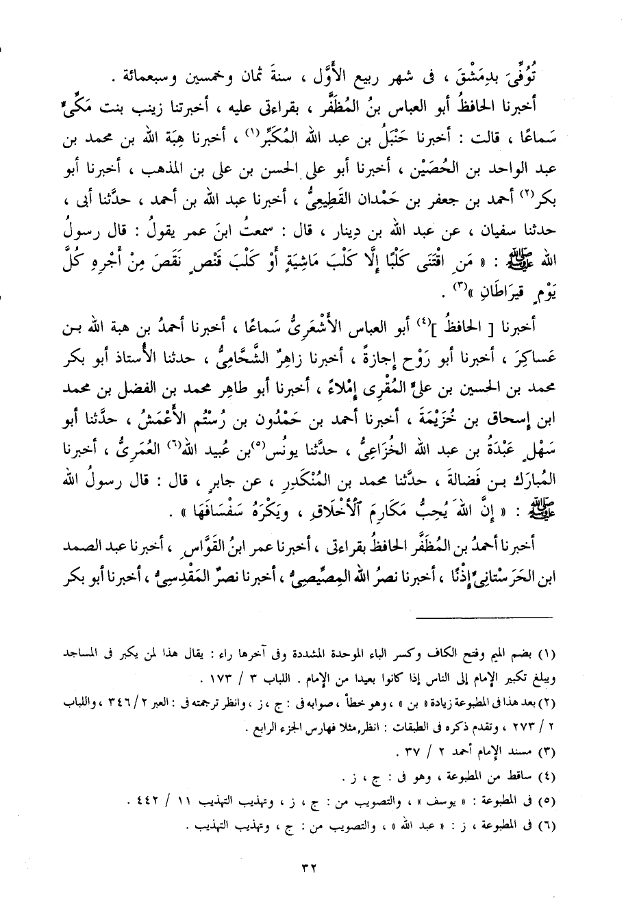 أخبرنَا الْحَافِظ أَبُو الْعَبَّاس المظفر بقراءاتي عَلَيْهِ أخبرتنا زَيْنَب بنت مكي سَمَاعا قَالَت أخبرنَا حَنْبَل بن عبد الله المكبر أخبرنَا هبة الله بن مُحَمَّد بن عبد الْوَاحِد بن الْحصين أخبرنَا أَبُو عَليّ الْحسن بن عَليّ بن الْمَذْهَب أخبرنَا أَبُو بكر أَحْمد بن جَعْفَر بن حمدَان الْقطيعِي أخبرنَا عبد الله بن أَحْمد حَدثنَا أبي حَدثنَا سُفْيَان عَن عبد الله بن دِينَار قَالَ سَمِعت ابْن عمر قَول قَالَ رَسُول الله صلى الله عَلَيْهِ وَسلم (من أقتنى كَلْبا إِلَّا كلب مَاشِيَة أَو كلب قنص نقص من أجره كل يَوْم قيراطان)