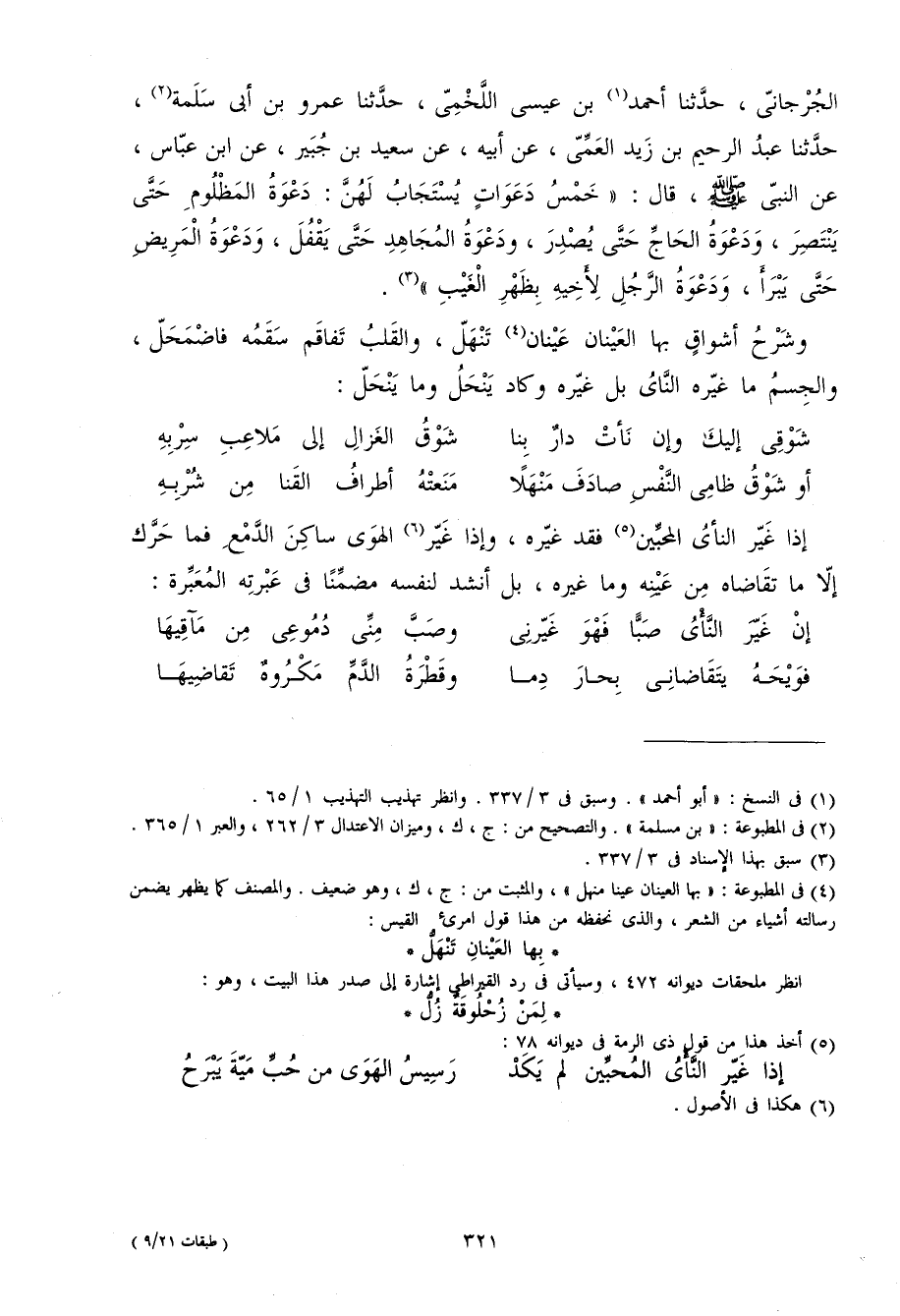 الْجِرْجَانِيّ حَدثنَا أَحْمد بن عِيسَى اللَّخْمِيّ حَدثنَا عَمْرو بن أبي سَلمَة حَدثنَا عبد الرَّحِيم بن زيد الْعمي عَن أَبِيه عَن سعيد بن جُبَير عَن ابْن عَبَّاس عَن النَّبِي صلى الله عَلَيْهِ وَسلم قَالَ (خمس دعوات يُسْتَجَاب لَهُنَّ دَعْوَة الْمَظْلُوم حَتَّى ينتصر ودعوة الْحَاج حَتَّى يصدر ودعوة الْمُجَاهِد حَتَّى يقفل ودعوة الْمَرِيض حَتَّى يبرأ ودعوة الرجل لِأَخِيهِ بِظهْر الْغَيْب)