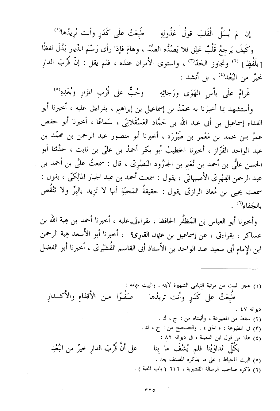 وأستشهد بِمَا أخبرنَا بِهِ مُحَمَّد بن إِسْمَاعِيل بن إِبْرَاهِيم بِقِرَاءَتِي عَلَيْهِ أخبرنَا أَبُو الْفِدَاء إِسْمَاعِيل بن أبي عبد الله بن حَمَّاد الْعَسْقَلَانِي سَمَاعا أخبرنَا أَبُو حَفْص عمر بن مُحَمَّد بن معمر بن طبرزد أخبرنَا أَبُو مَنْصُور عبد الرَّحْمَن بن مُحَمَّد بن عبد الْوَاحِد الْقَزاز أخبرنَا الْخَطِيب أَبُو بكر أَحْمد بن عَليّ بن ثَابت حَدثنَا أَبُو الْحسن عَليّ بن أَحْمد بن نعيم بن الْجَارُود الْبَصْرِيّ قَالَ سَمِعت عَليّ بن أَحْمد بن عبد الرَّحْمَن الفِهري الْأَصْبَهَانِيّ يَقُول سَمِعت أَحْمد بن عبد الْجَبَّار الْمَالِكِي يَقُول سَمِعت يحيى بن معَاذ الرَّازِيّ يَقُول حَقِيقَة الْمحبَّة أَنَّهَا لَا تزيد بِالْبرِّ وَلَا تنقص بالجفاء