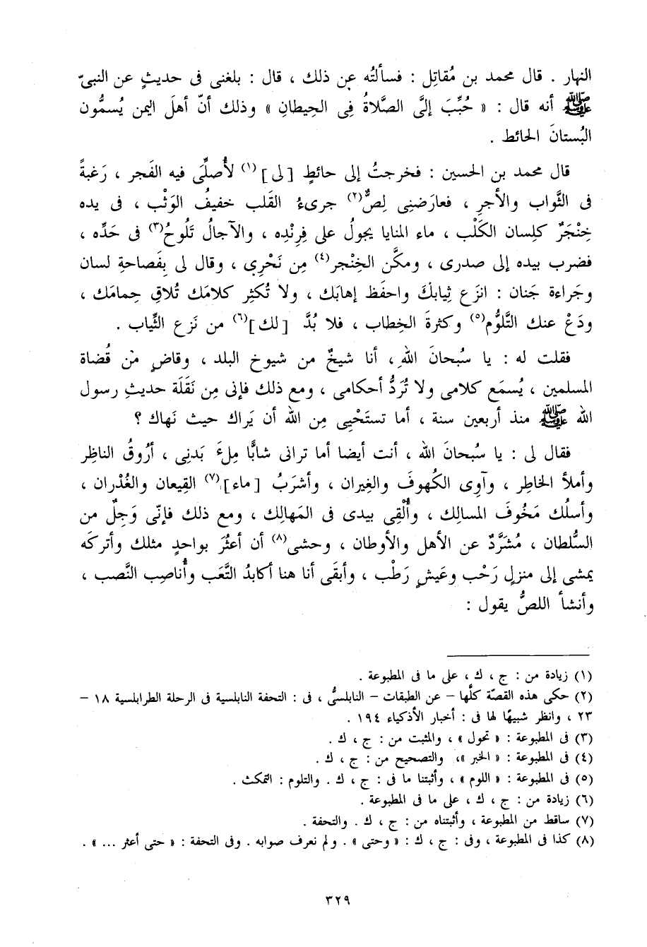 قَالَ مُحَمَّد بن الْحُسَيْن فَخرجت إِلَى حَائِط لي لأصلي فِيهِ الْفجْر رَغْبَة فِي الثَّوَاب وَالْأَجْر فعارضني لص جريء الْقلب خَفِيف الوثب فِي يَده خنجر كلسان الْكَلْب مَاء المنايا يجول على فرنده والآجال تلوح فِي حَده فَضرب بِيَدِهِ إِلَى صَدْرِي وَمكن الخنجر من نحري وَقَالَ لي بفصاحة لِسَان وجراءة جنان انْزعْ ثِيَابك واحفظ إهابك وَلَا تكْثر كلامك تلاق حمامك ودع عَنْك التَّلَوُّم وَكَثْرَة الْخطاب فَلَا بُد لَك من نزع الثِّيَاب
