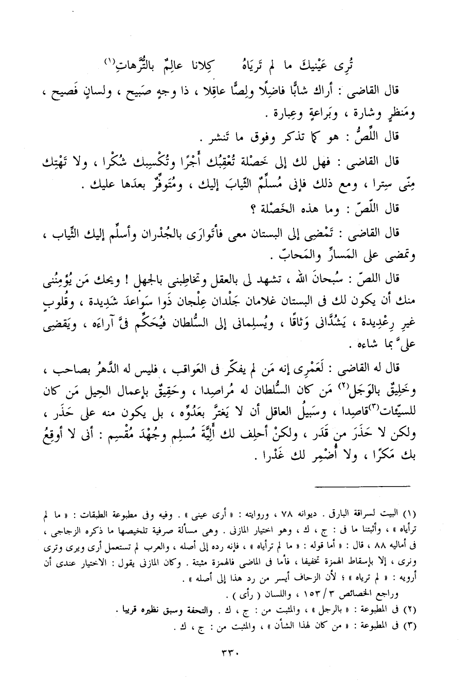 قَالَ اللص سُبْحَانَ الله تشهد لي بِالْعقلِ وتخاطبني بِالْجَهْلِ وَيحك من يؤمنني مِنْك أَن يكون لَك فِي الْبُسْتَان غلامان جلدان علجان ذَوا سواعد شَدِيدَة وَقُلُوب غير رعيدة يشداني وثاقا ويسلماني إِلَى السُّلْطَان فَيحكم فِي آراءه وَيَقْضِي عَليّ بِمَا شاءه