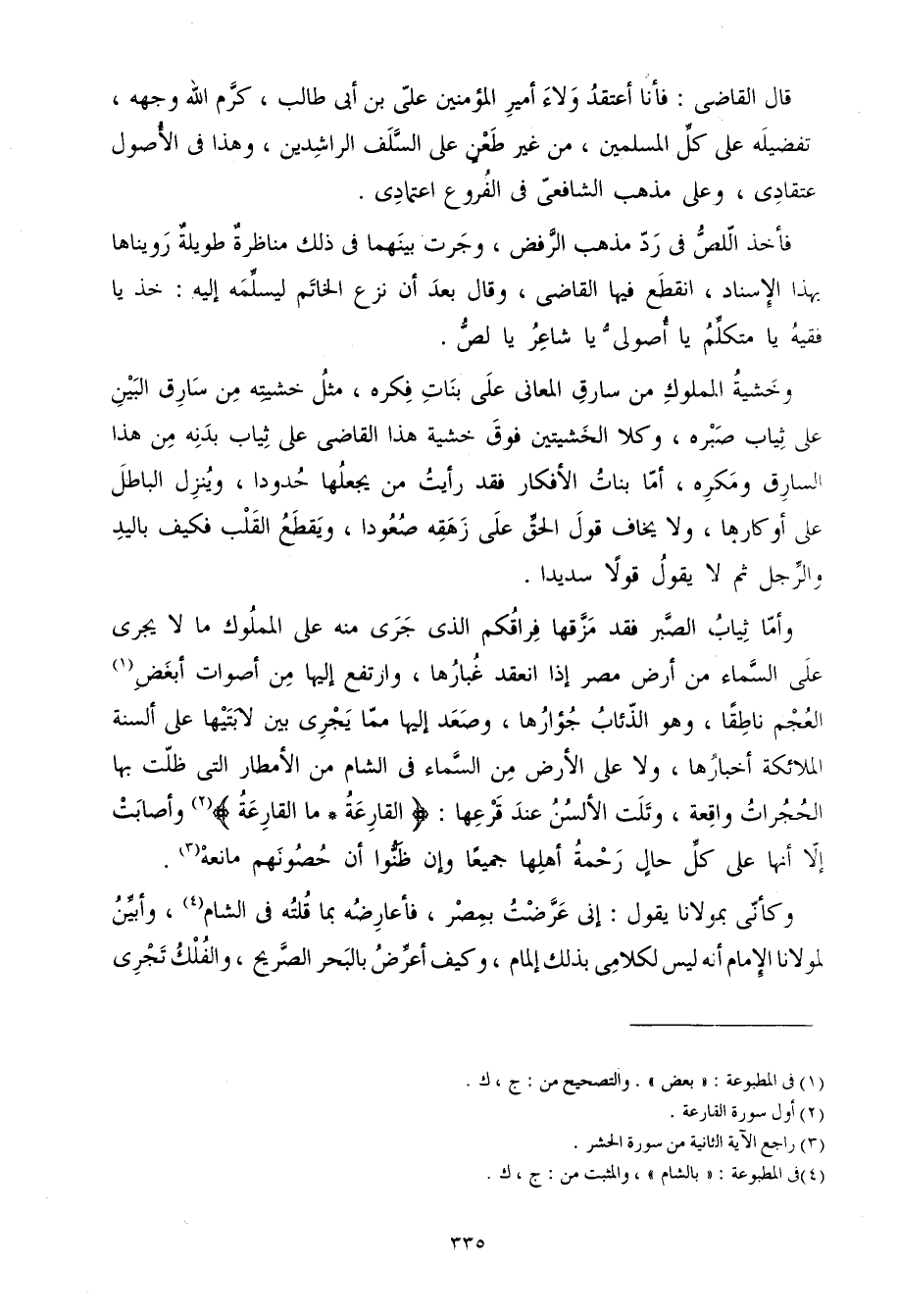 قَالَ القَاضِي فَأَنا أعتقد وَلَاء أَمِير الْمُؤمنِينَ عَليّ بن أبي طَالب كرم الله وَجهه تفضيله على كل الْمُسلمين من غير طعن على السّلف الرَّاشِدين وَهَذَا فِي الْأُصُول اعتقادي وعَلى مَذْهَب الشَّافِعِي فِي الْفُرُوع اعتمادي