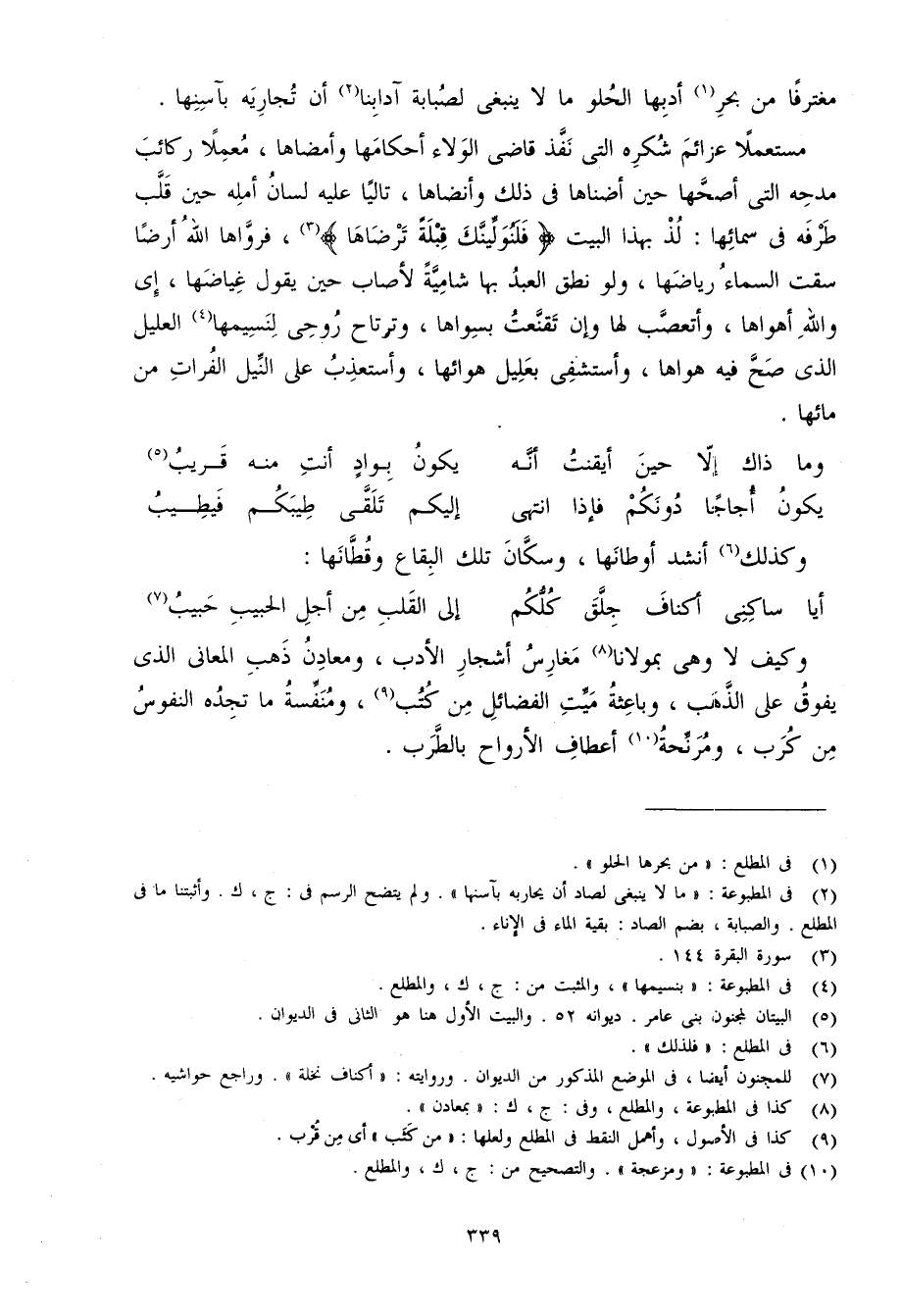 مُسْتَعْملا عزائم شكره الَّتِي نفذ قَاضِي الْوَلَاء أَحْكَامهَا وأمضاها معملا ركائب مدحه الَّتِي أَصَحهَا حِين أضناها فِي ذَلِك وأضناها تاليا عَلَيْهِ لِسَان أمله حِين قلب طرفه فِي سمائها لذ بِهَذَا الْبَيْت {فلنولينك قبْلَة ترضاها} فرواها الله أَرضًا سقت السَّمَاء رياضها وَلَو نطق العَبْد بهَا شامية لأصاب حِين يَقُول غياضها إِي وَالله أهواها وأتعصب لَهَا وَإِن تقنعت بسواها وترتاح روحي لنسيمها العليل الَّذِي صَحَّ فِيهِ هَواهَا وأستشفي بعليل هوائها وأستعذب على النّيل الْفُرَات من مَائِهَا