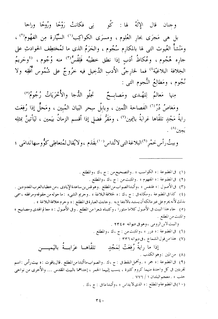 بل هِيَ مجْرى بحار الْعُلُوم ومسرى الْكَوَاكِب السيارة من الفهوم ومنشأ الغيوث الَّتِي لَهَا بالمكارم سجوم وَالْحرم الَّذِي مَا لمختطف الْحَوَادِث على جَاره هجوم وعكاظ أدب إِذا نطق خَطِيبه فلقس مِنْهُ وجوم وحريم الْخلَافَة البلاغية فَمَا لخارجي الْأَدَب الدخيل فِيهِ خُرُوج على شموس أفقه وَلَا نُجُوم ومطالع النُّجُوم الَّتِي