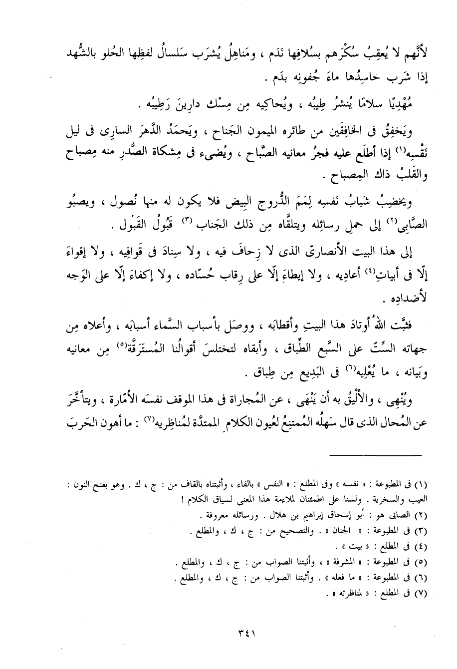 ويخفق فِي خافقين من طَائِره الميمون الْجنَاح ويحمد الدَّهْر الساري فِي ليل نَفسه إِذا أطلع عَلَيْهِ فجر مَعَانِيه الصَّباح ويضيء فِي مشكاة الصَّدْر مِنْهُ مِصْبَاح وَالْقلب ذَاك الْمِصْبَاح