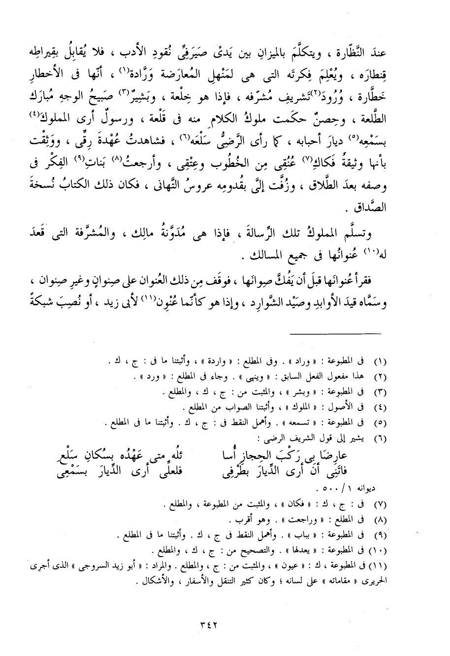 عِنْد النظارة وَيتَكَلَّم بالميزان بَين يَدي صيرفي نقود الْأَدَب فَلَا يُقَابل بقيراطه قنطاره وَيعلم فكرته الَّتِي هِيَ لمنهل الْمُعَارضَة ورادة أَنَّهَا فِي الأخطار خطارة وُرُود تشريف مشرفه فَإِذا هُوَ خلعة وَبشير صبيح الْوَجْه مبارك الطلعة وحصن حكمت مُلُوك الْكَلَام مِنْهُ فِي قلعة وَرَسُول أرى الْمَمْلُوك بسمعه ديار أحبابه كَمَا رأى الرضي سلعه فشاهدت عُهْدَة رقي ووثقت بِأَنَّهَا وَثِيقَة فكاك عنقِي من الخطوب وعتقي وأرجعت بَنَات الْفِكر فِي وَصفه بعد الطَّلَاق وزفت إِلَيّ بقدومه عروس التهاني فَكَانَ ذَلِك الْكتاب نُسْخَة الصَدَاق