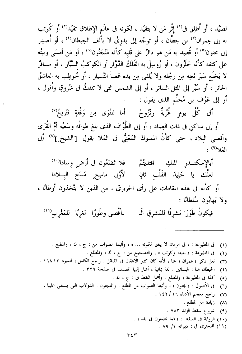 لصيد أَو أطلق فِي إِثْر من لَا يتَقَيَّد لكَونه فِي عَالم الْإِطْلَاق تقيد أَو كُوتِبَ بِهِ إِلَى عمرَان بن حطَّان أَو توجه إِلَى بدوي لَا يألف الْحِيطَان أَو أصدر إِلَى مَجْنُون أَو قصد بِهِ من هُوَ دائر على قلبه كَأَنَّهُ منجنون أَو من أَمْسَى وبيته على كتفه كَأَنَّهُ حلزون أَو روسل بِهِ الْفلك الدوار أَو الْكَوْكَب السيار أَو مُسَافر لَا يخلع سير نَعله من رجله وَلَا يلقى من يَده عَصا التسيار أَو خُوطِبَ بِهِ العاشق الحائر أَو سير إِلَى الْمثل السائر أَو إِلَى الشَّمْس الَّتِي لَا تنفك فِي شروق وأفول أَو إِلَى عَوْف بن محلم الَّذِي يَقُول