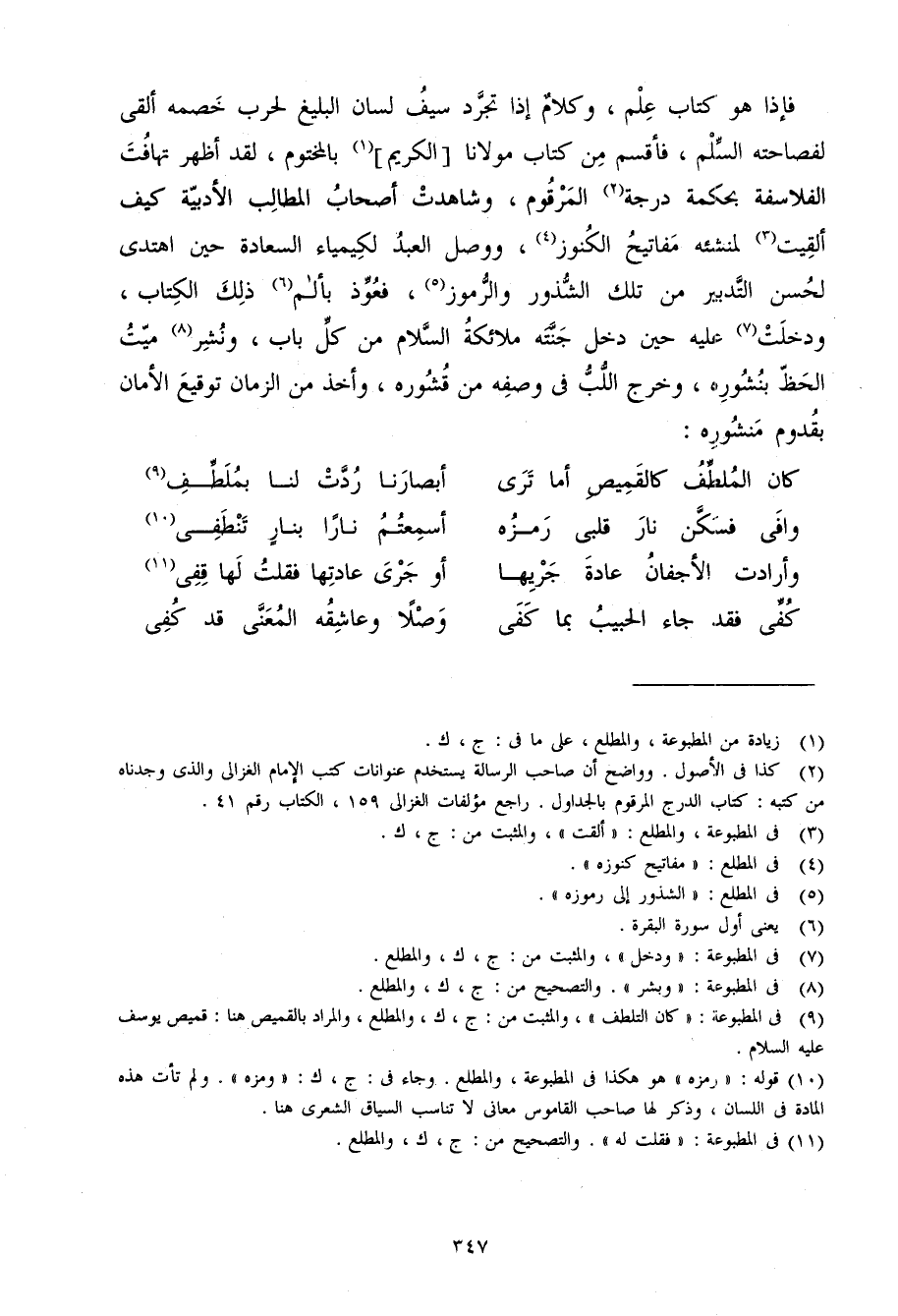 فَإِذا هُوَ كتاب علم وَكَلَام إِذا تجرد سيف لِسَان البليغ لِحَرْب خَصمه ألْقى لفصاحته السّلم فأقسم من كتاب مَوْلَانَا الْكَرِيم بالمختوم لقد أظهر تهافت الفلاسفة بحكمة دَرَجَة المرقوم وشاهدت أَصْحَاب المطالب الأدبية كَيفَ ألقيت لمنشئه مَفَاتِيح الْكُنُوز وَوصل العَبْد لكيمياء السَّعَادَة حِين اهْتَدَى لحسن التَّدْبِير من تِلْكَ الشذور والرموز فعوذ بألم ذَلِك الْكتاب وَدخلت عَلَيْهِ حِين دخل جنته مَلَائِكَة السَّلَام من كل بَاب وَنشر ميت الْحَظ بنشوره وَخرج اللب فِي وَصفه من قشوره وَأخذ من الزَّمَان توقيع الْأمان بقدوم منشوره