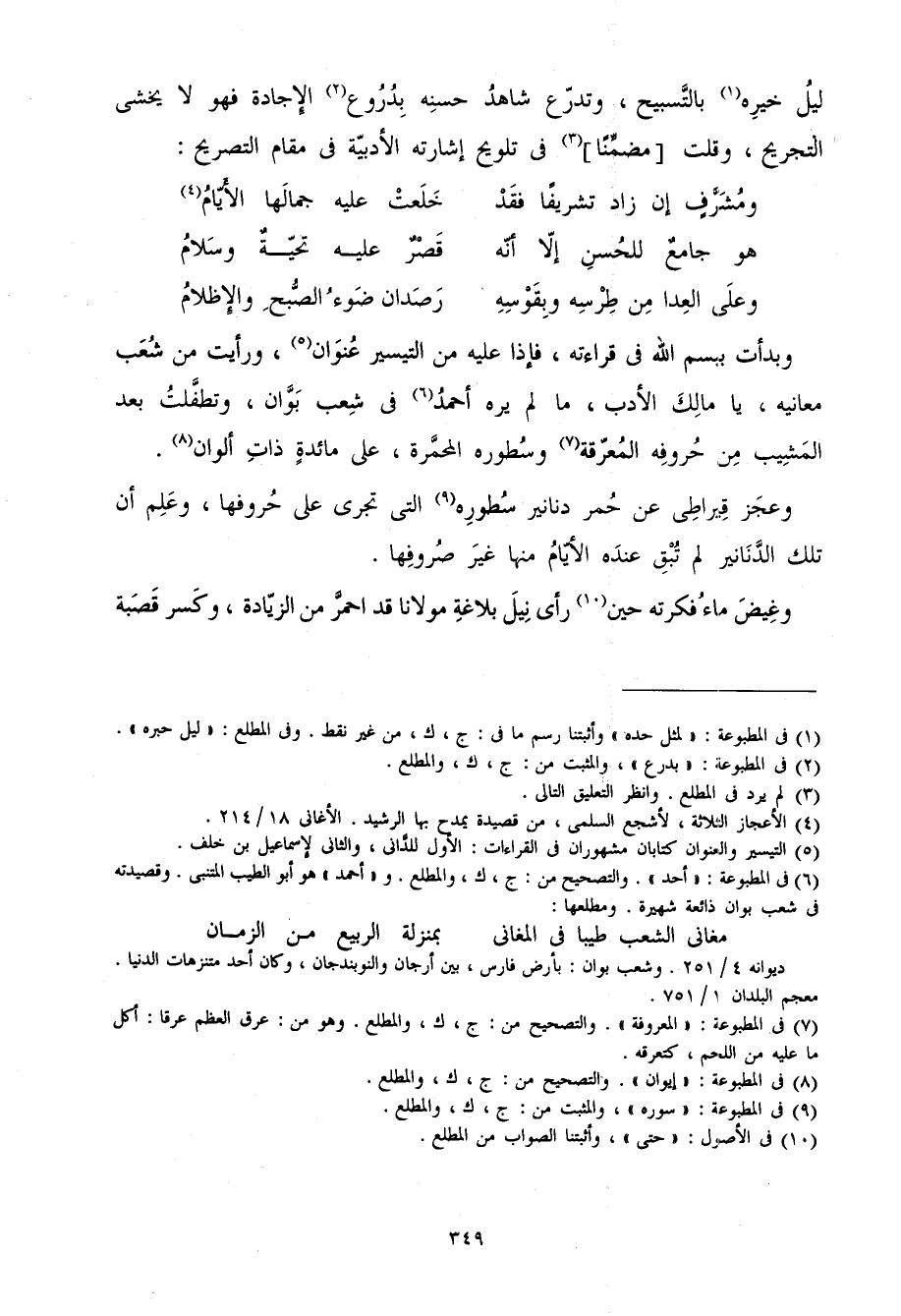 ليل خَيره بالتسبيح وتدرع شَاهد حسنه بدروع الإجادة فَهُوَ لَا يخْشَى التجريح وَقلت مضمنا فِي تلويح إِشَارَته الأدبية فِي مقَام التَّصْرِيح
