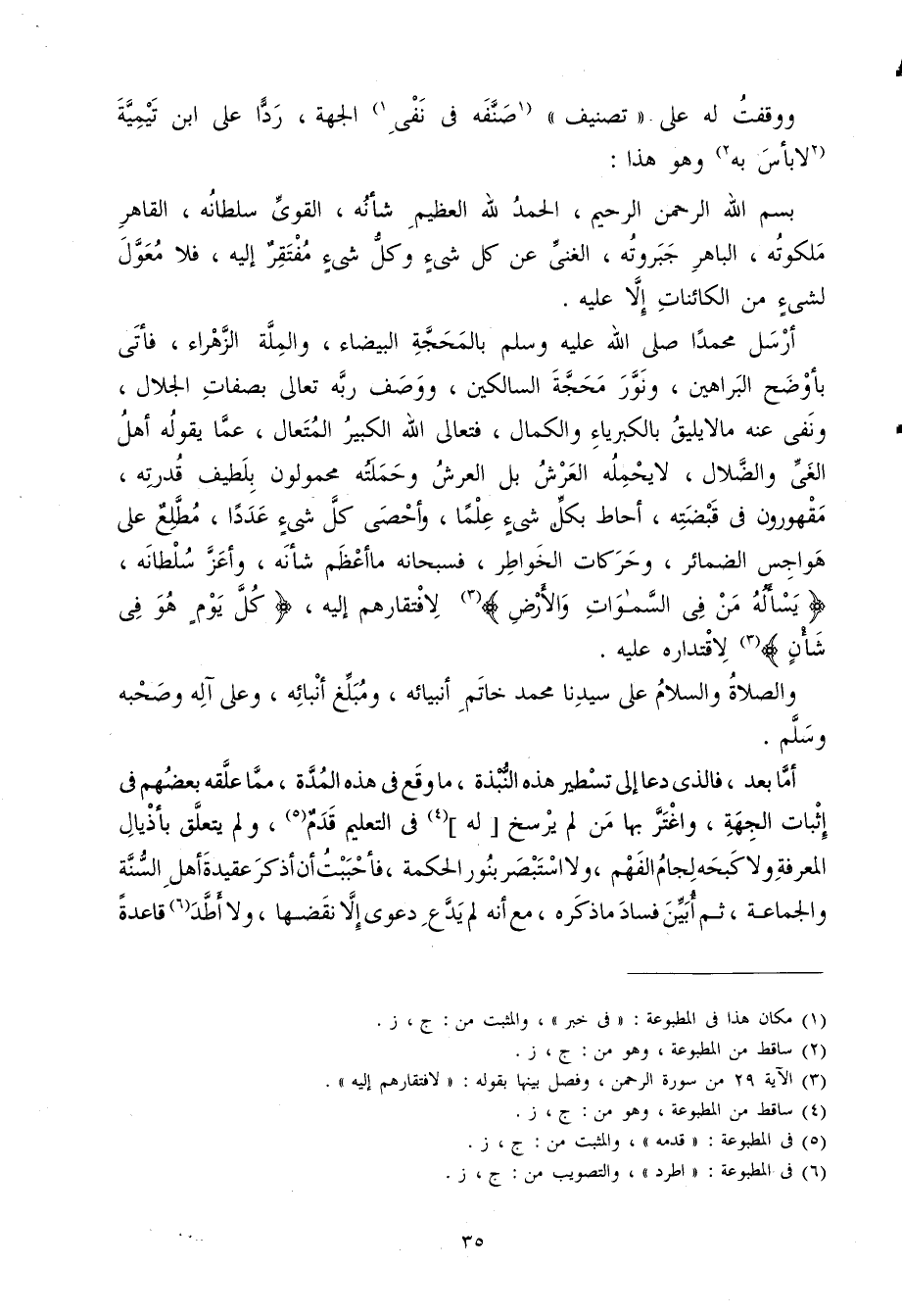 أما بعد فَالَّذِي دَعَا إِلَى تسطير هَذِه النبذة مَا وَقع فِي هَذِه الْمدَّة مِمَّا علقه بَعضهم فِي إِثْبَات الْجِهَة واغتر بهَا من لم يرسخ لَهُ فِي التَّعْلِيم قدم وَلم يتَعَلَّق بأذيال الْمعرفَة وَلَا كبحه لجام الْفَهم وَلَا استبصر بِنور الْحِكْمَة فَأَحْبَبْت أَن أذكر عقيدة أهل السّنة وَالْجَمَاعَة ثمَّ أبين فَسَاد مَا ذكره مَعَ أَنه لم يدع دَعْوَى إِلَّا نقضهَا وَلَا أطد قَاعِدَة