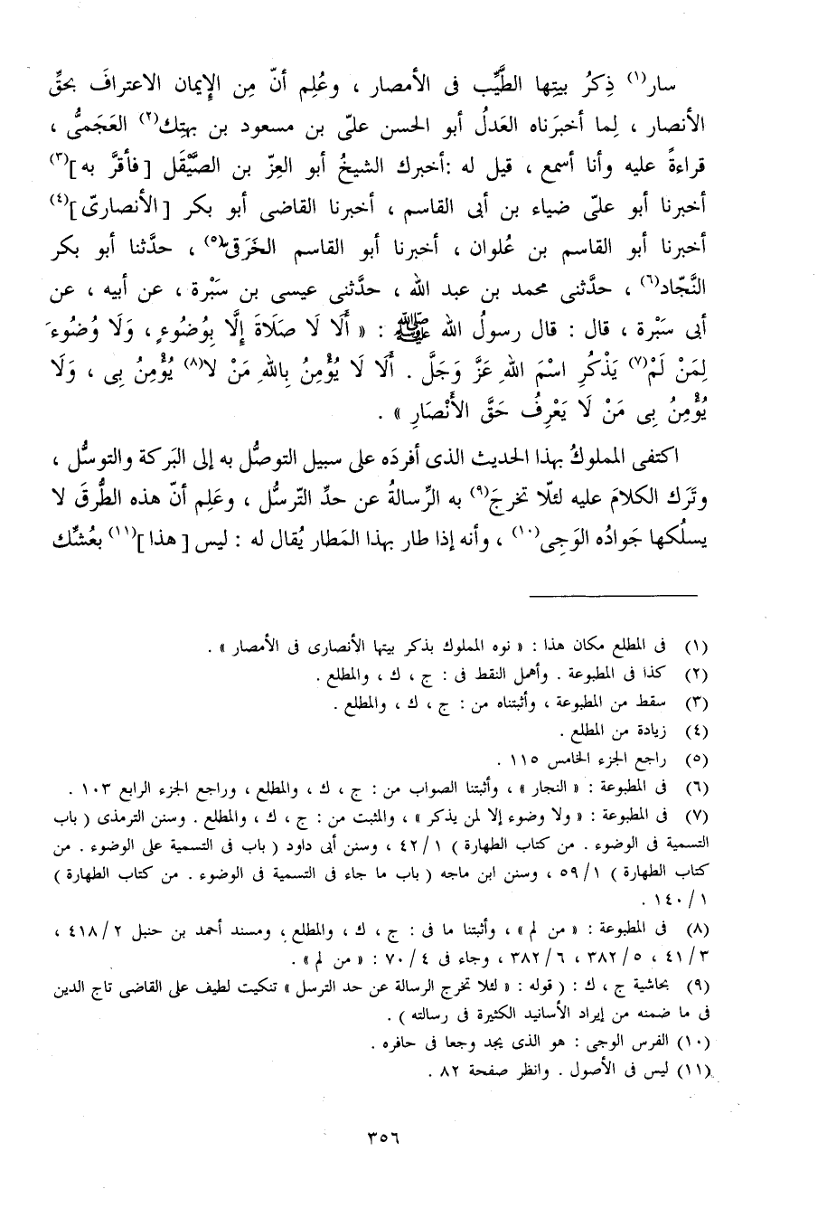 سَار ذكر بَيتهَا الطّيب فِي الْأَمْصَار وَعلم أَن من الْإِيمَان الِاعْتِرَاف بِحَق الْأَنْصَار لما أخبرناه الْعدْل أَبُو الْحسن عَليّ بن مَسْعُود بن بهتك العجمي قِرَاءَة عَلَيْهِ وَأَنا أسمع قيل لَهُ أخْبرك الشَّيْخ أَبُو الْعِزّ بن الصيقل فَأقر بِهِ أخبرنَا أَبُو عَليّ ضِيَاء بن أبي الْقَاسِم أخبرنَا القَاضِي أَبُو بكر الْأنْصَارِيّ أخبرنَا أَبُو الْقَاسِم بن علوان أخبرنَا أَبُو الْقَاسِم الْخرقِيّ حَدثنَا أَبُو بكر النجاد حَدثنِي مُحَمَّد بن عبد الله حَدثنِي عِيسَى بن سُبْرَة عَن أَبِيه عَن أبي سُبْرَة قَالَ قَالَ رَسُول الله صلى الله عَلَيْهِ وَسلم (أَلا لَا صَلَاة إِلَّا بِوضُوء وَلَا وضوء لمن لم يذكر اسْم الله عز وَجل أَلا لَا يُؤمن بِاللَّه من لَا يُؤمن بِي وَلَا يُؤمن بِي من لَا يعرف حق الْأَنْصَار)