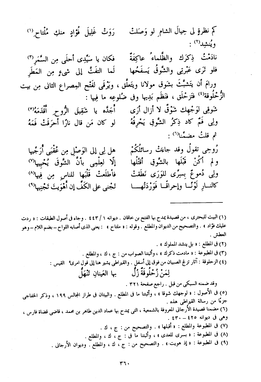 (كم نظرة لي حِيَال الشَّام لَو وصلت ... رَوَت غليل فؤاد مِنْك ملتاح)