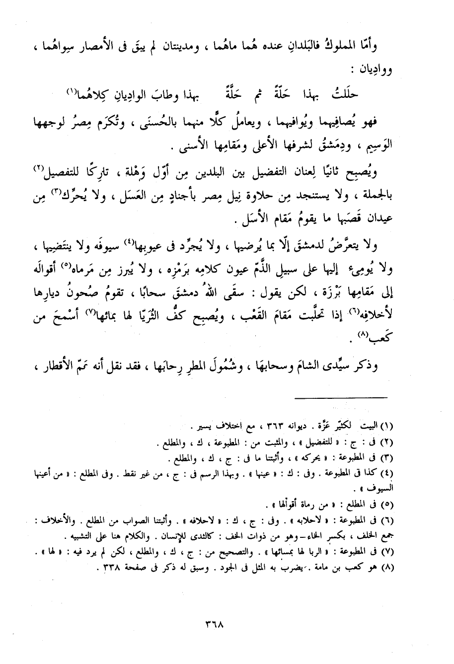 وَلَا يتَعَرَّض لدمشق إِلَّا بِمَا يرضيها وَلَا يجرد فِي عيوبها سيوفه وَلَا ينتضيها وَلَا يُومِئ إِلَيْهَا على سَبِيل الذَّم عُيُون كَلَامه برمزه وَلَا يبرز من مرماه أَقْوَاله إِلَى مقَامهَا بَرزَة لَكِن يَقُول سقى الله دمشق سحابا تقوم صحون ديارها لأخلافه إِذا تحلبت مقَام الْقَعْب وَيُصْبِح كف الثريا لَهَا بِمَائِهَا أسمح من كَعْب