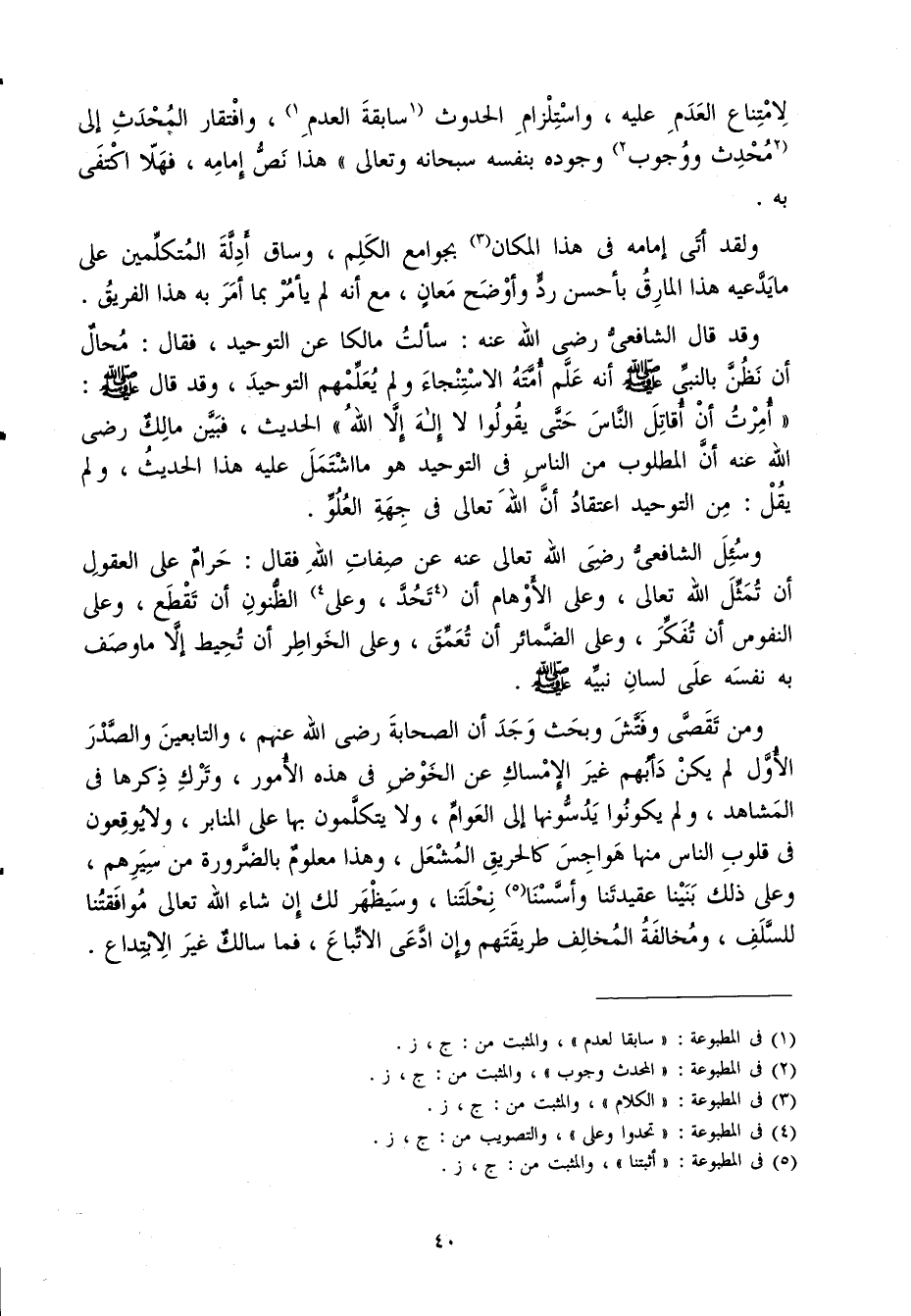 وَمن تقصى وفتش وَبحث وجد أَن الصَّحَابَة رَضِي الله عَنْهُم وَالتَّابِعِينَ والصدر الأول لم يكن دأبهم غير الْإِمْسَاك عَن الْخَوْض فِي هَذِه الْأُمُور وَترك ذكرهَا فِي الْمشَاهد وَلم يَكُونُوا يدسونها إِلَى الْعَوام وَلَا يَتَكَلَّمُونَ بهَا على المنابر وَلَا يوقعون فِي قُلُوب النَّاس مِنْهَا هواجس كالحريق المشعل وَهَذَا مَعْلُوم بِالضَّرُورَةِ من سيرهم وعَلى ذَلِك بنينَا عقيدتنا وأسسنا نحلتنا وسيظهر لَك إِن شَاءَ الله تَعَالَى موافقتنا للسلف وَمُخَالفَة الْمُخَالف طريقتهم وَإِن ادّعى الِاتِّبَاع فَمَا سالك غير الابتداع