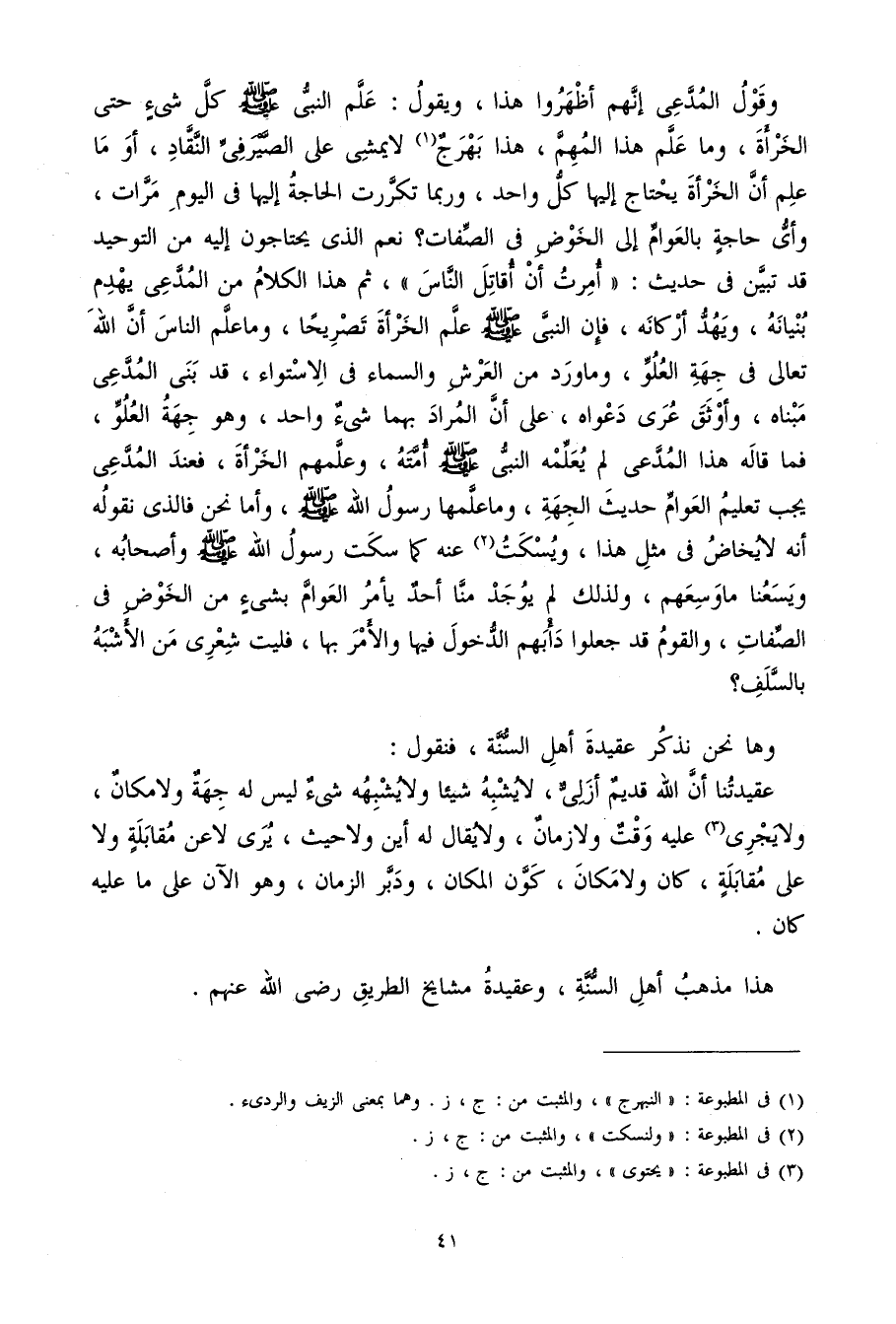 هَذَا مَذْهَب أهل السّنة وعقيدة مَشَايِخ الطَّرِيق رَضِي الله عَنْهُم
