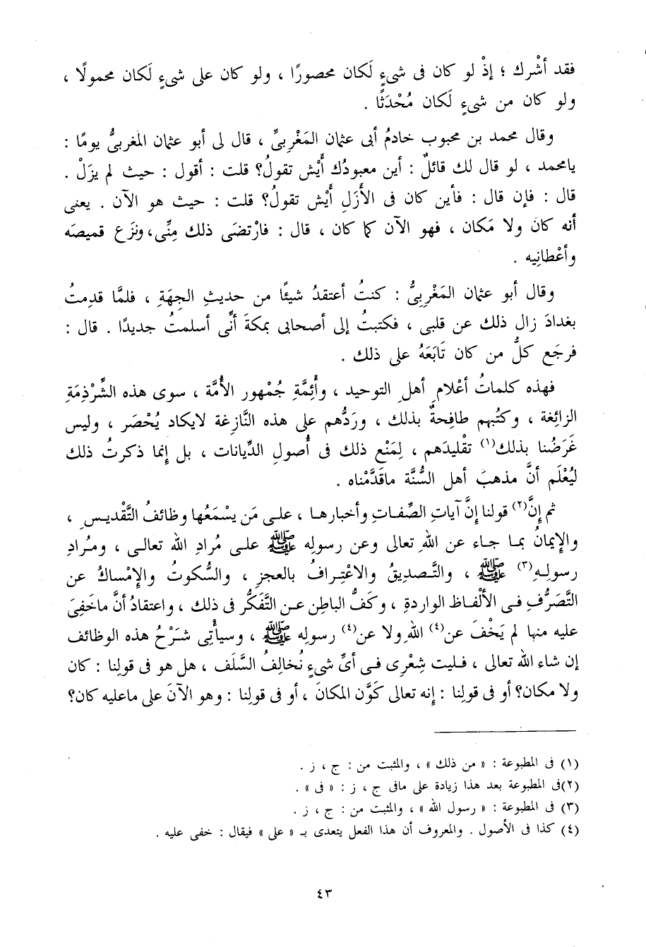 فَهَذِهِ كَلِمَات أَعْلَام أهل التَّوْحِيد وأئمة جُمْهُور الْأمة سوى هَذِه الشرذمة الزائغة وكتبهم طافحة بذلك وردهم على هَذِه النازغة لَا يكَاد يحصر وَلَيْسَ عرضا بذلك تقليدهم لمنع ذَلِك فِي أصُول الديانَات بل إِنَّمَا ذكرت ذَلِك ليعلم أَن مَذْهَب أهل السّنة مَا قدمْنَاهُ