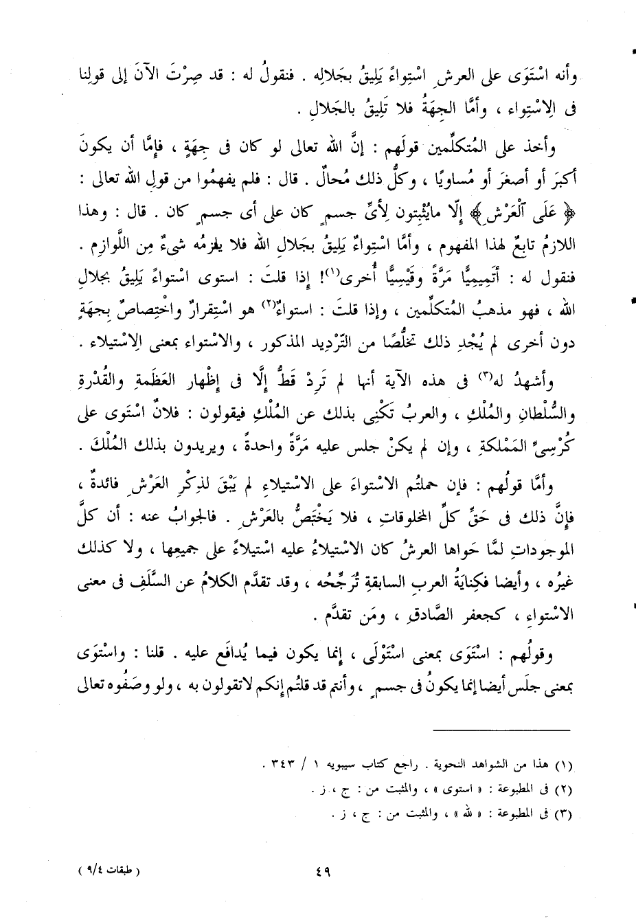 قُلْنَا واستوى بمنى جلس أَيْضا إِنَّمَا يكون فِي جسم وَأَنْتُم قد قُلْتُمْ إِنَّكُم لَا تَقولُونَ بِهِ وَلَو وصفوه تَعَالَى