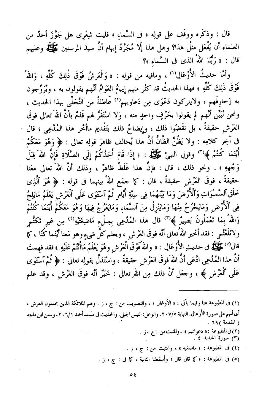 وَأما حَدِيث الأوعال وَمَا فِيهِ من قَوْله (وَالْعرش فَوق ذَلِك كُله وَالله فَوق ذَلِك كُله) فَهَذَا الحَدِيث قد كثر مِنْهُم إِيهَام الْعَوام أَنهم يَقُولُونَ بِهِ ويروجون بِهِ زخارفهم وَلَا يتركون دَعْوَى من دعاويهم عاطلة من التحلي بِهَذَا الحَدِيث وَنحن نبين أَنهم لم يَقُولُوا بِحرف وَاحِد مِنْهُ وَلَا اسْتَقر لَهُم قدم بِأَن الله تَعَالَى فَوق الْعَرْش حَقِيقَة بل نقضوا ذَلِك وإيضاح ذَلِك بِتَقْدِيم مَا أخر هَذَا الْمُدَّعِي قَالَ فِي آخر كَلَامه وَلَا يظنّ الظَّان أَن هَذَا يُخَالف ظَاهر قَوْله تَعَالَى {وَهُوَ مَعكُمْ أَيْن مَا كُنْتُم} وَقَول النَّبِي صلى الله عَلَيْهِ وَسلم (إِذا قَامَ أحدكُم إِلَى الصَّلَاة فَإِن الله قبل وَجهه)