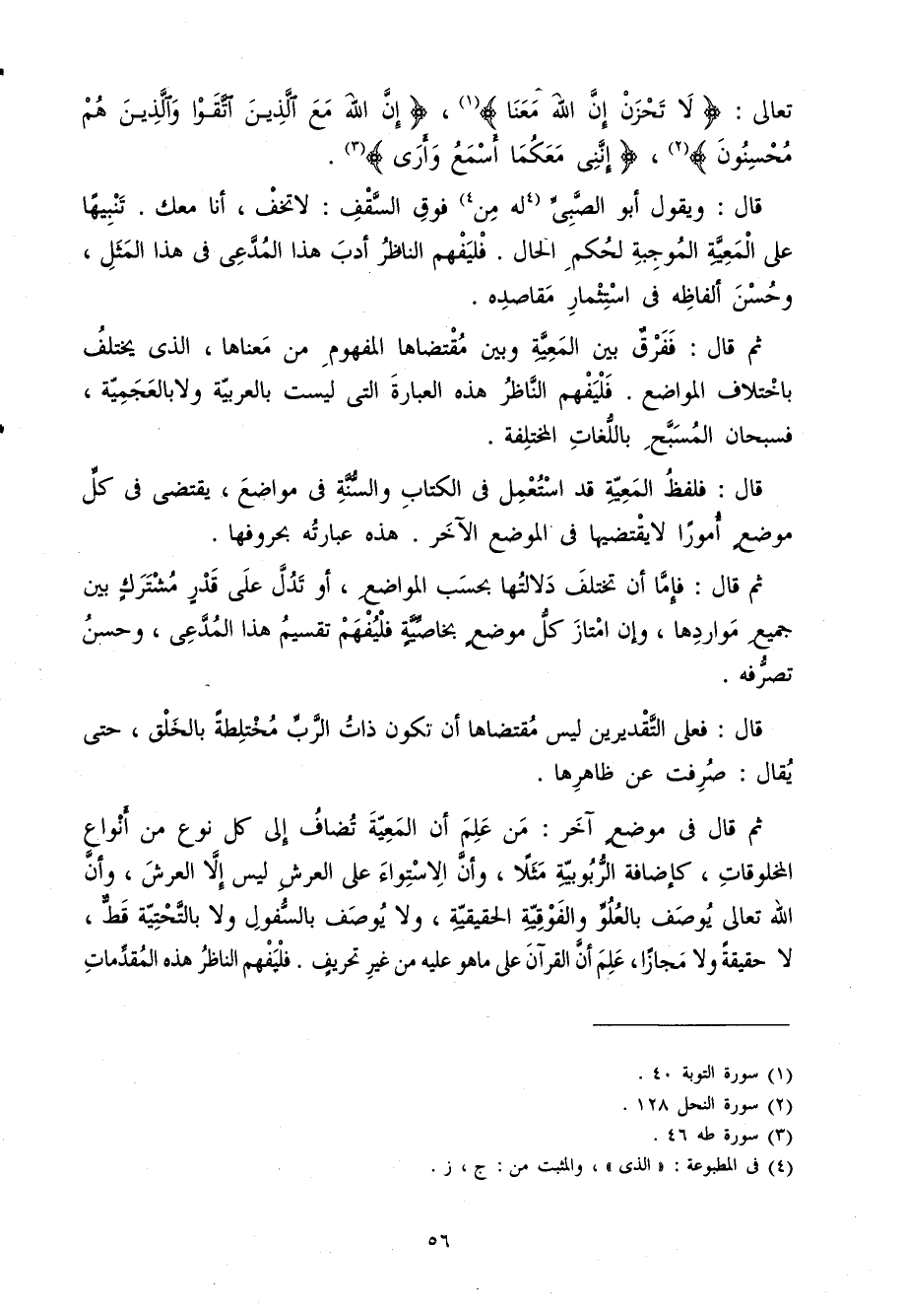 ثمَّ قَالَ فِي مَوضِع آخر من علم أَن الْمَعِيَّة تُضَاف إِلَى كل نوع من أَنْوَاع الْمَخْلُوقَات كإضافة الربوبية مثلا وَأَن الاسْتوَاء على الْعَرْش لَيْسَ إِلَّا الْعَرْش وَأَن الله تَعَالَى يُوصف بالعلو والفوقية الْحَقِيقِيَّة وَلَا يُوصف بالسفول وَلَا بالتحتية قطّ لَا حَقِيقَة وَلَا مجَازًا علم أَن الْقُرْآن على مَا هُوَ عَلَيْهِ من غير تَحْرِيف